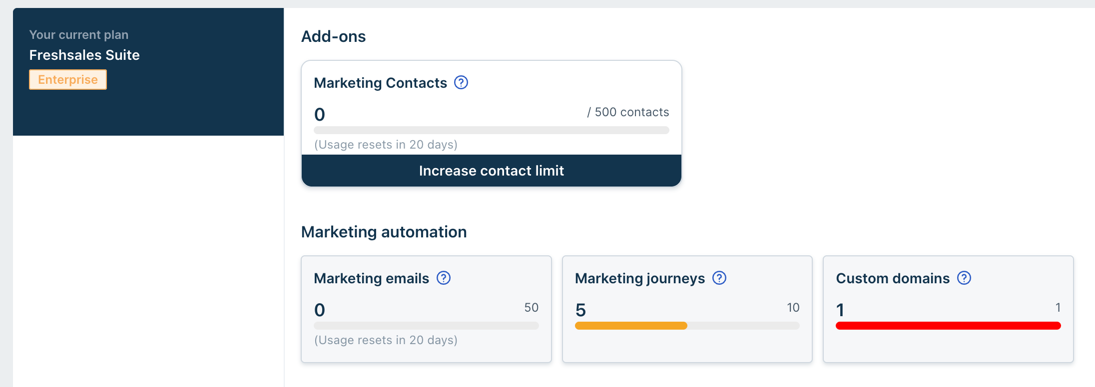 Your account includes a certain number of marketing contacts you can start out with based on your Freshmarketer plan (Free, Growth, Pro, and Enterprise). You can also purchase additional marketing contacts in increments of 5,000 anytime. Your marketing contact limit is reset every month. You can track your usage in-app, and when you’re nearing your monthly limit, we will notify you with an in-app banner message and via email.