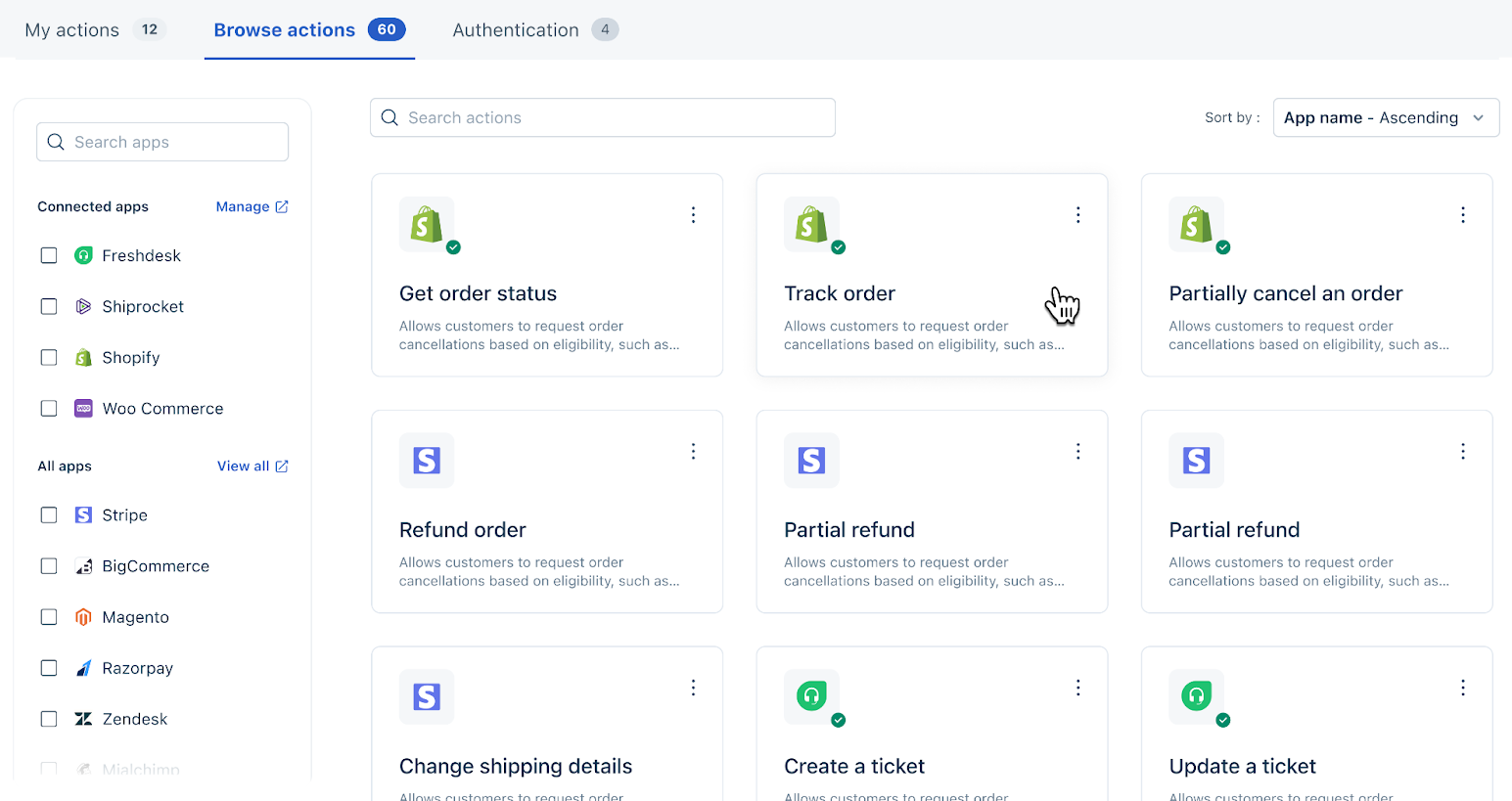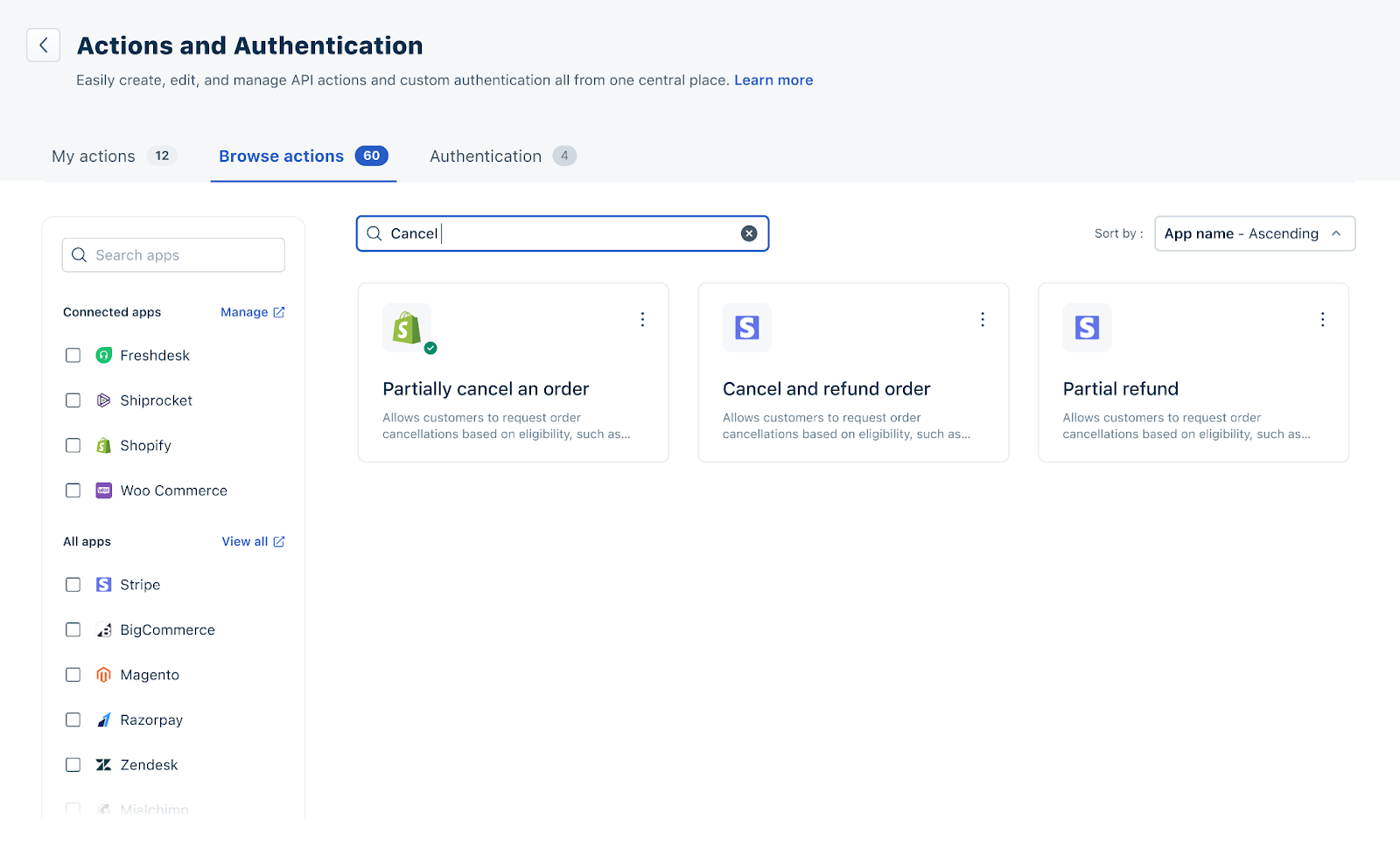 - Here, you can select the API Action that you want for a particular app. You can search by Action (for example: Get order details) or app name (for example: Shopify). You can also filter by specific apps on the left, so Actions related to those apps appear.
