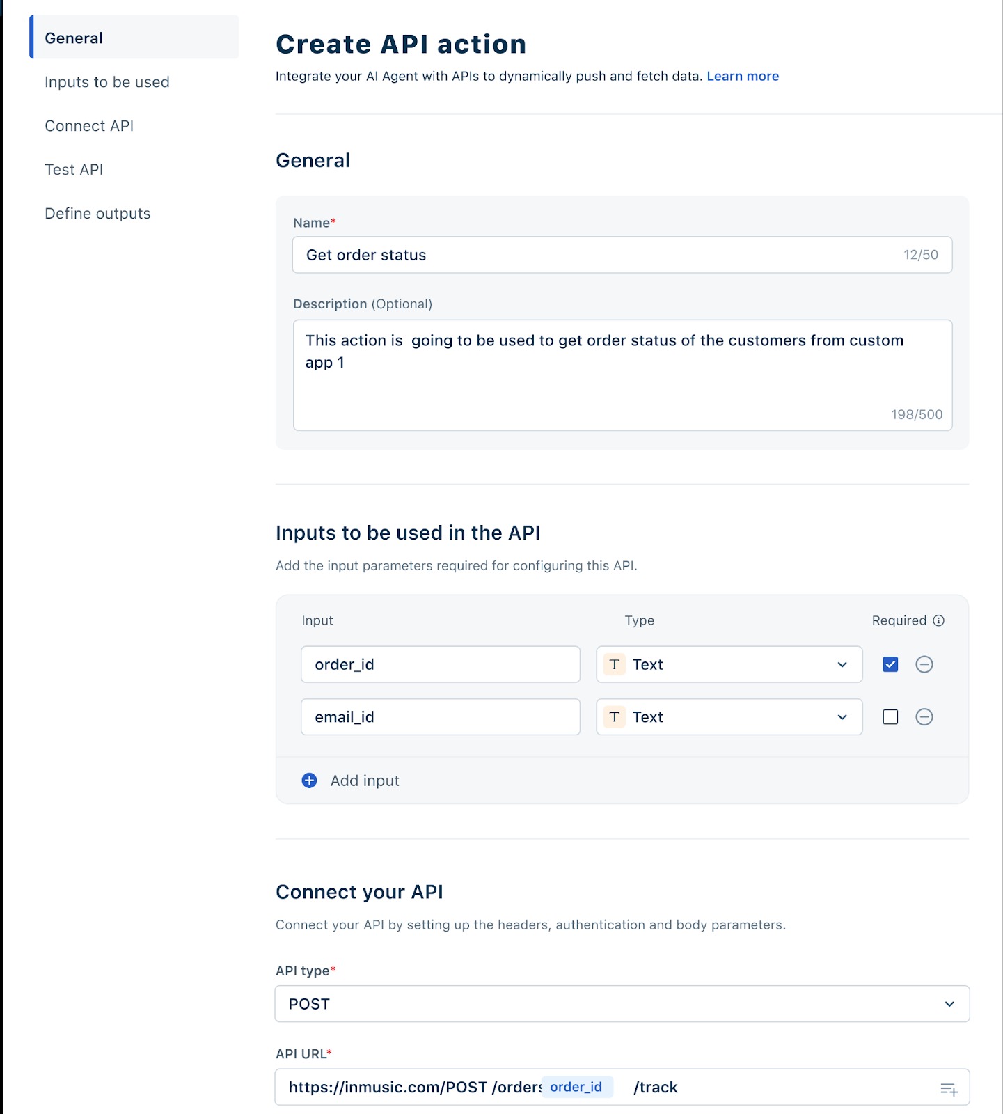 - Under Inputs to be used, add the input parameters required for configuring this API. For example, order_id. You can also choose the input type (Text, Number, etc.) and mark it as Required if needed.