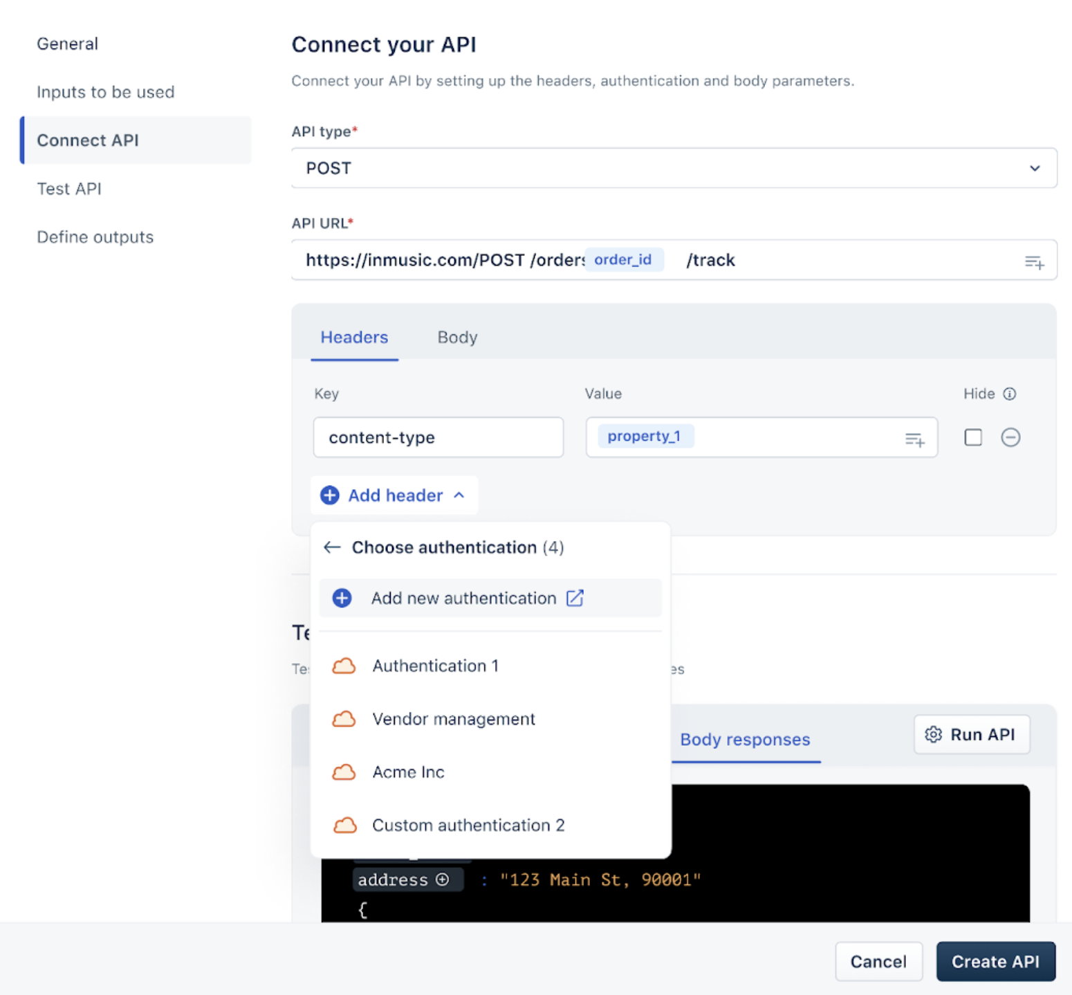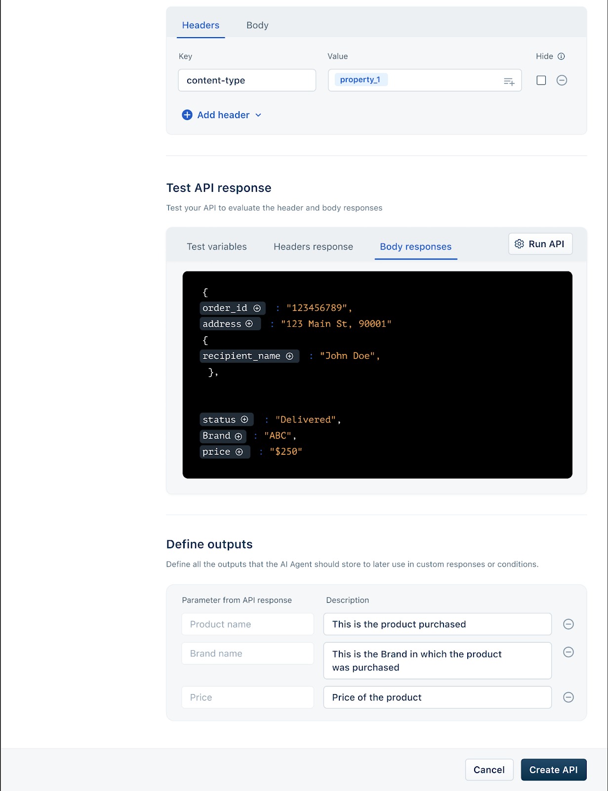 - Scroll down to Test API response. Here, you can input sample variables and click Run API to verify if the connection is working correctly. You’ll see the live response displayed under Body responses.