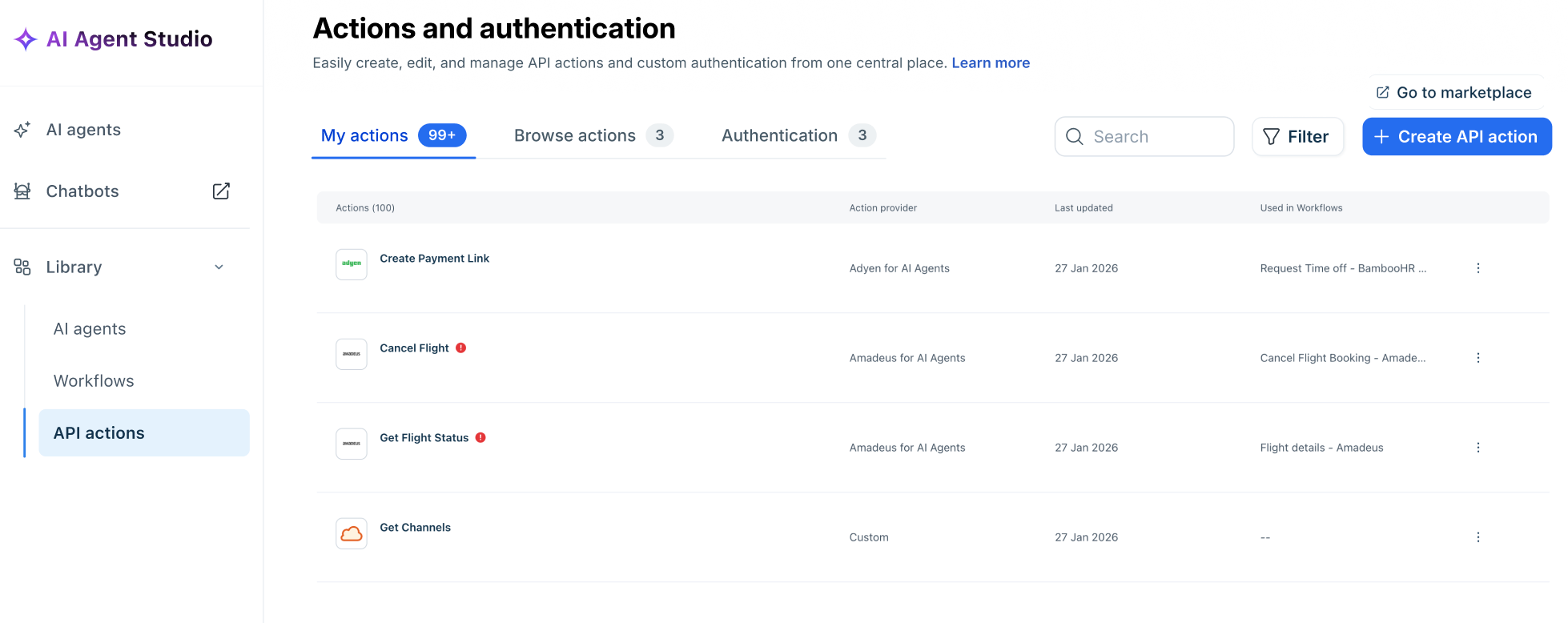 - On the left navbar, click AI Agent Studio > Library > API Actions.
