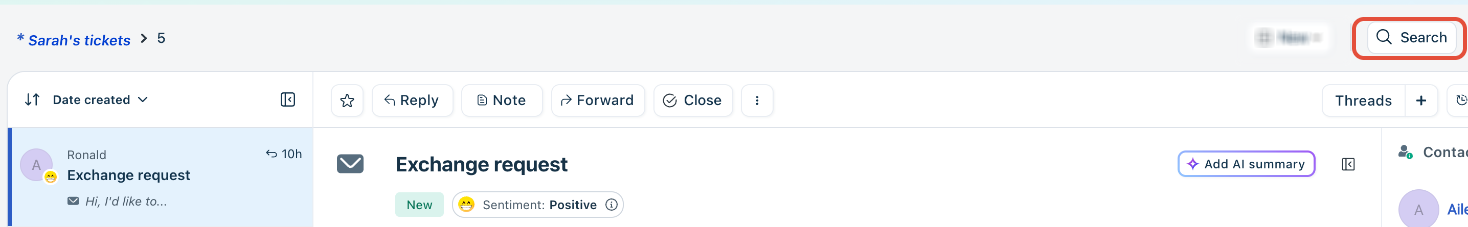Freshdesk has a robust search box that helps agents and admins find information quickly across their tickets, customers, and self-service resources.