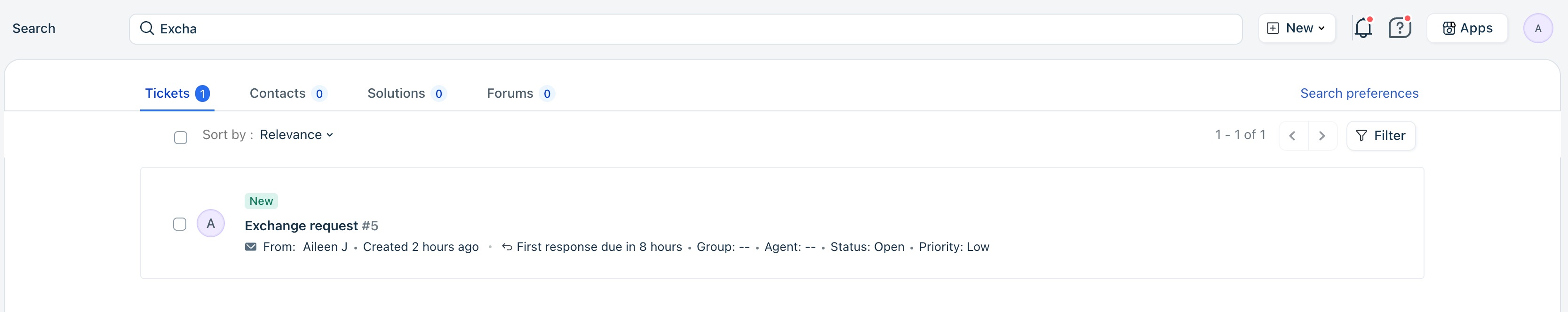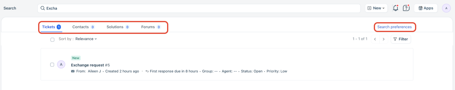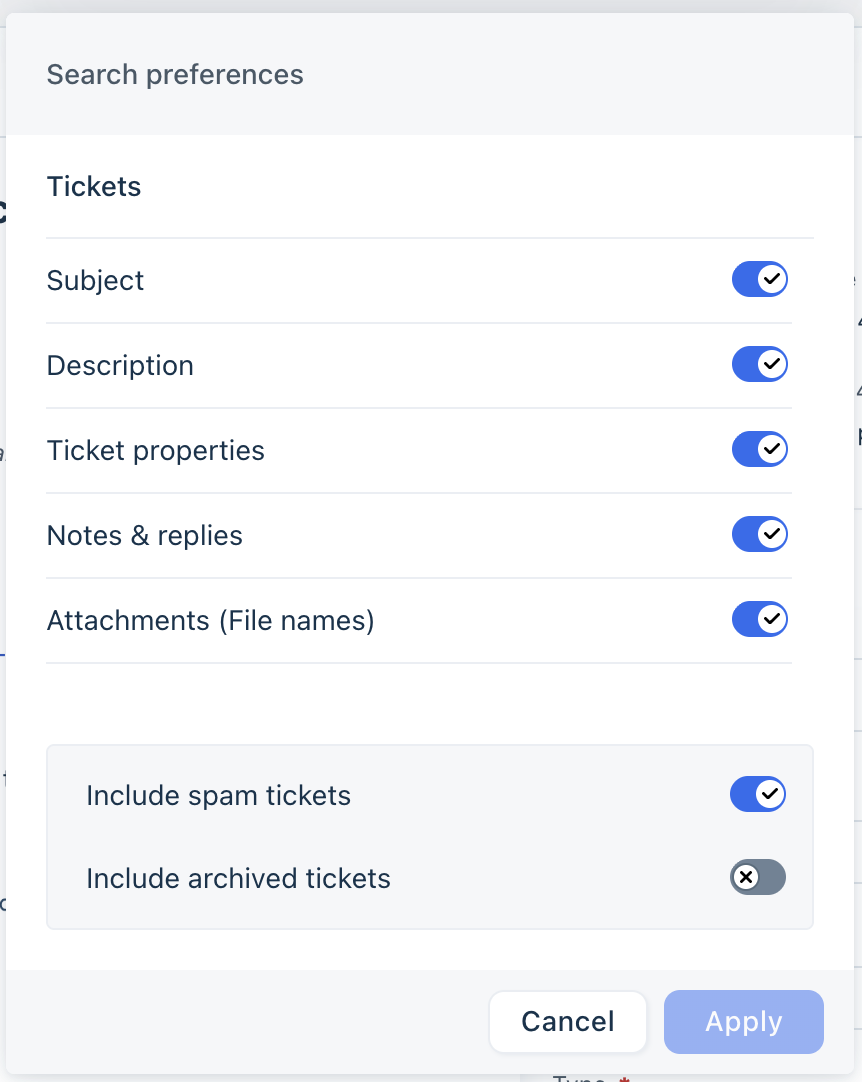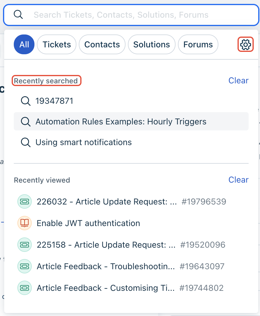 - Updates in tickets, contacts, etc., take a few minutes to be indexed. They will not show up in search results during those few minutes.