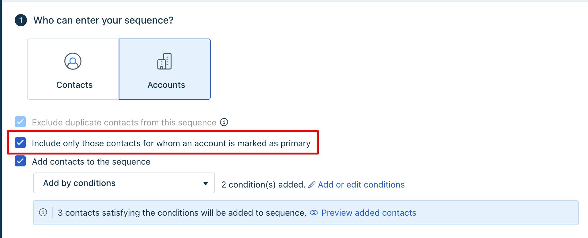When accounts are added, if you choose the option "Include only those contacts for whom an account is marked as primary", based on the conditions that you have set, the system will check the related contacts whose primary sales account matches the conditions, and those will be added to the sequence.