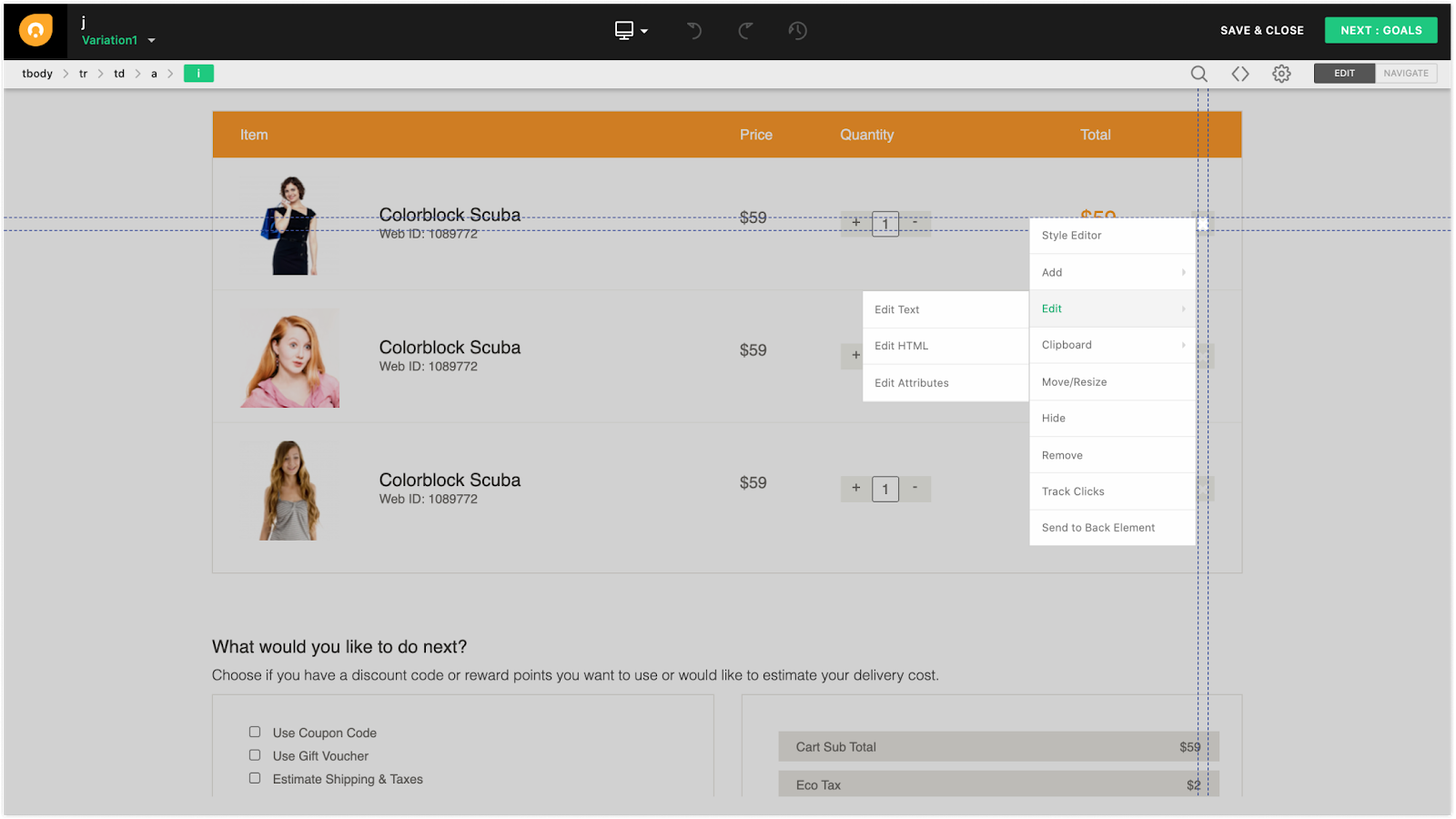 The web application’s WYSIWYG editor opens up with all the different actions, that allow you to create a variation from the original page.