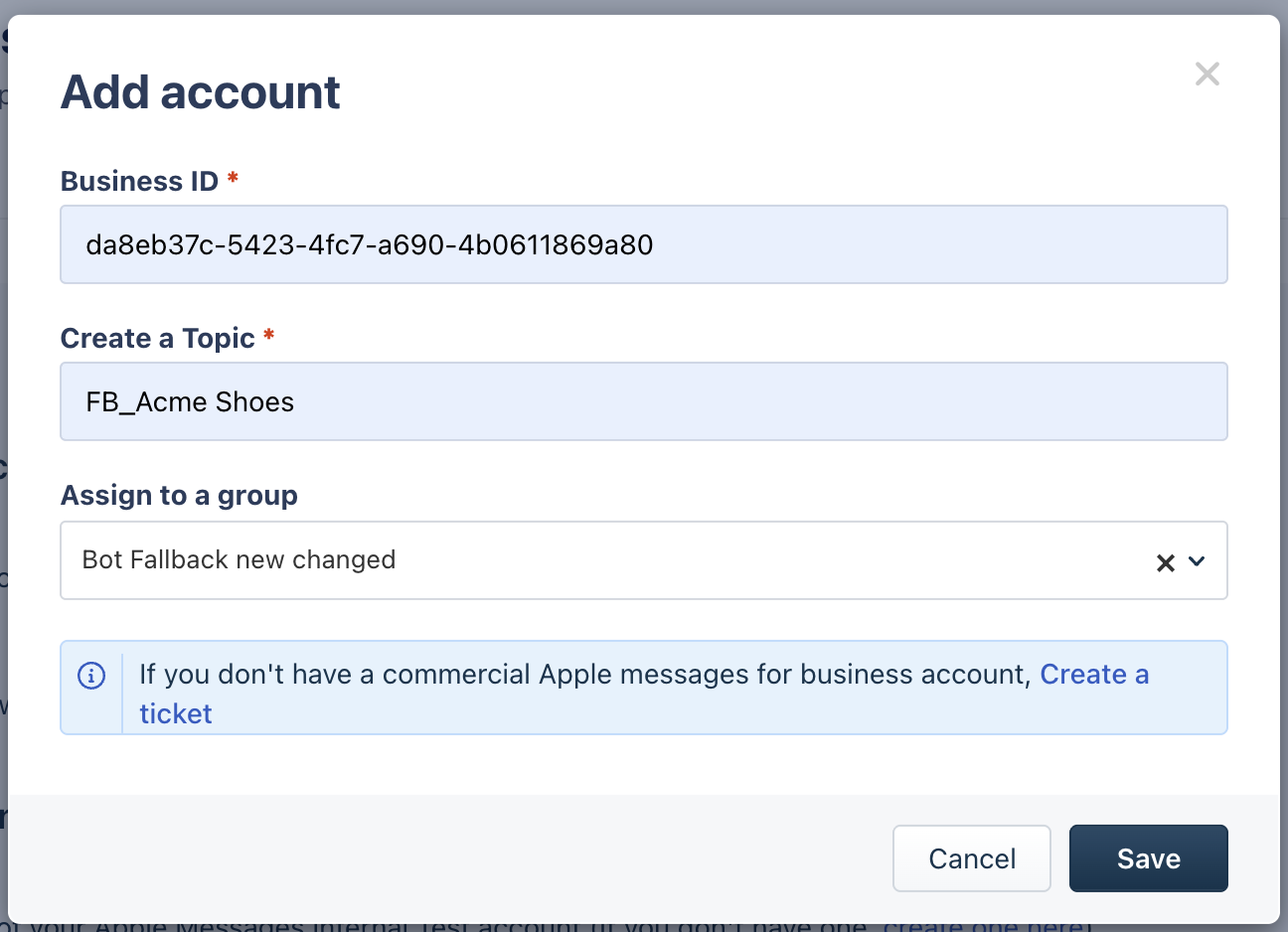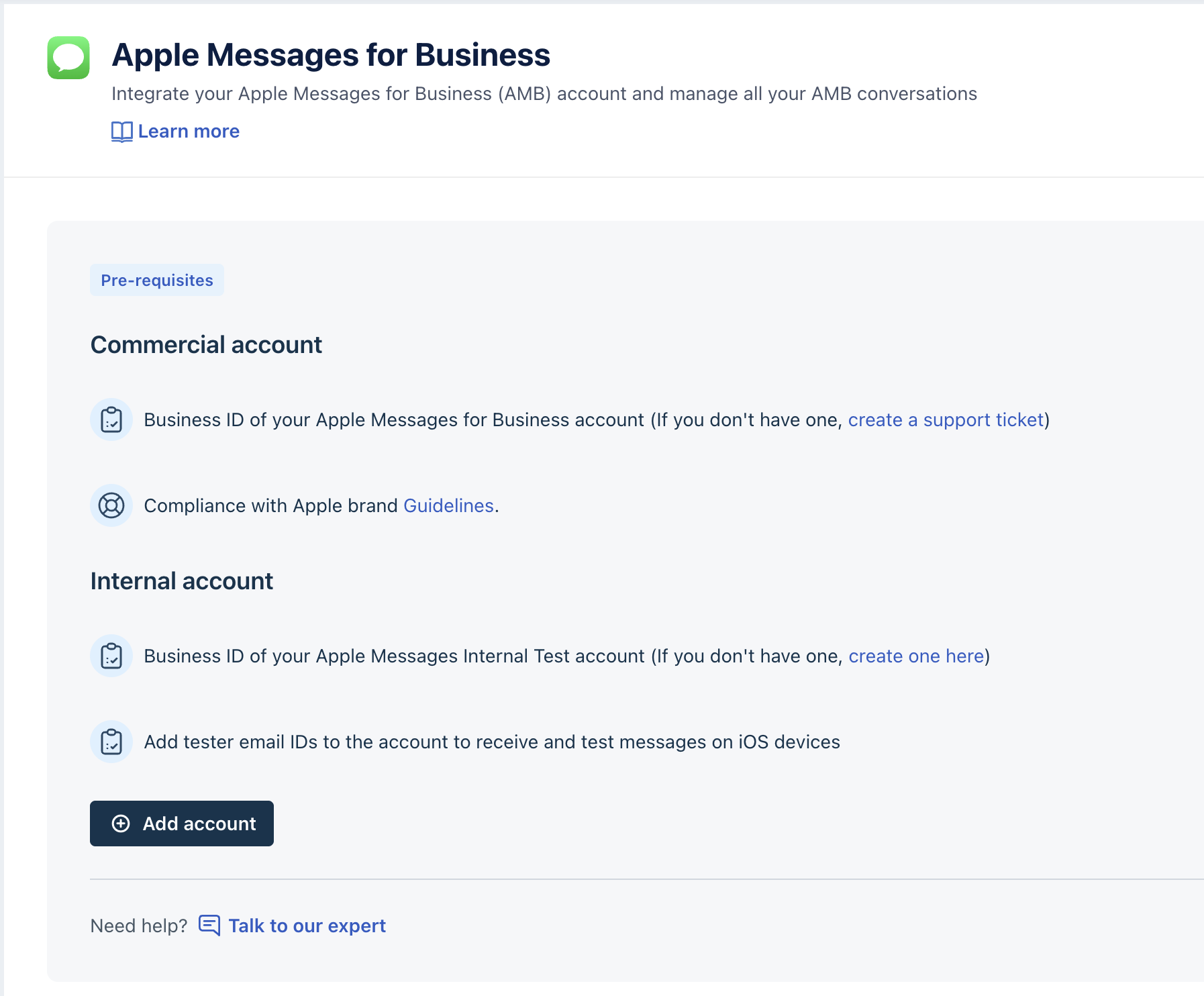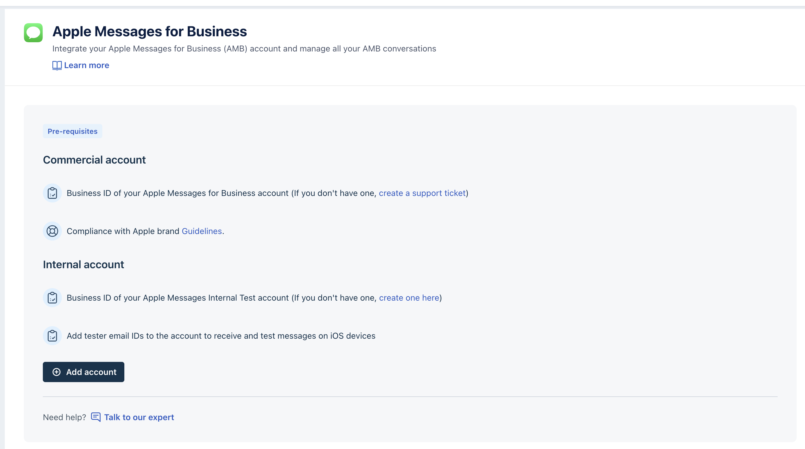 Note: Creating support tickets is mandatory only for commercial Apple Messages Business accounts. You can still set up an internal test account for testing purposes.