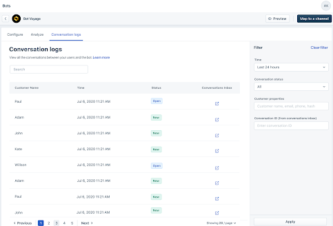You can use the Analyze and Conversation logs tab to view the bot's performance and review specific conversations.