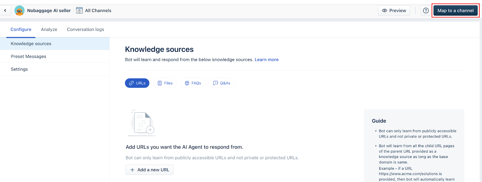 Choose the channel of your preference to make the AI agent live by clicking on Map to Channel.