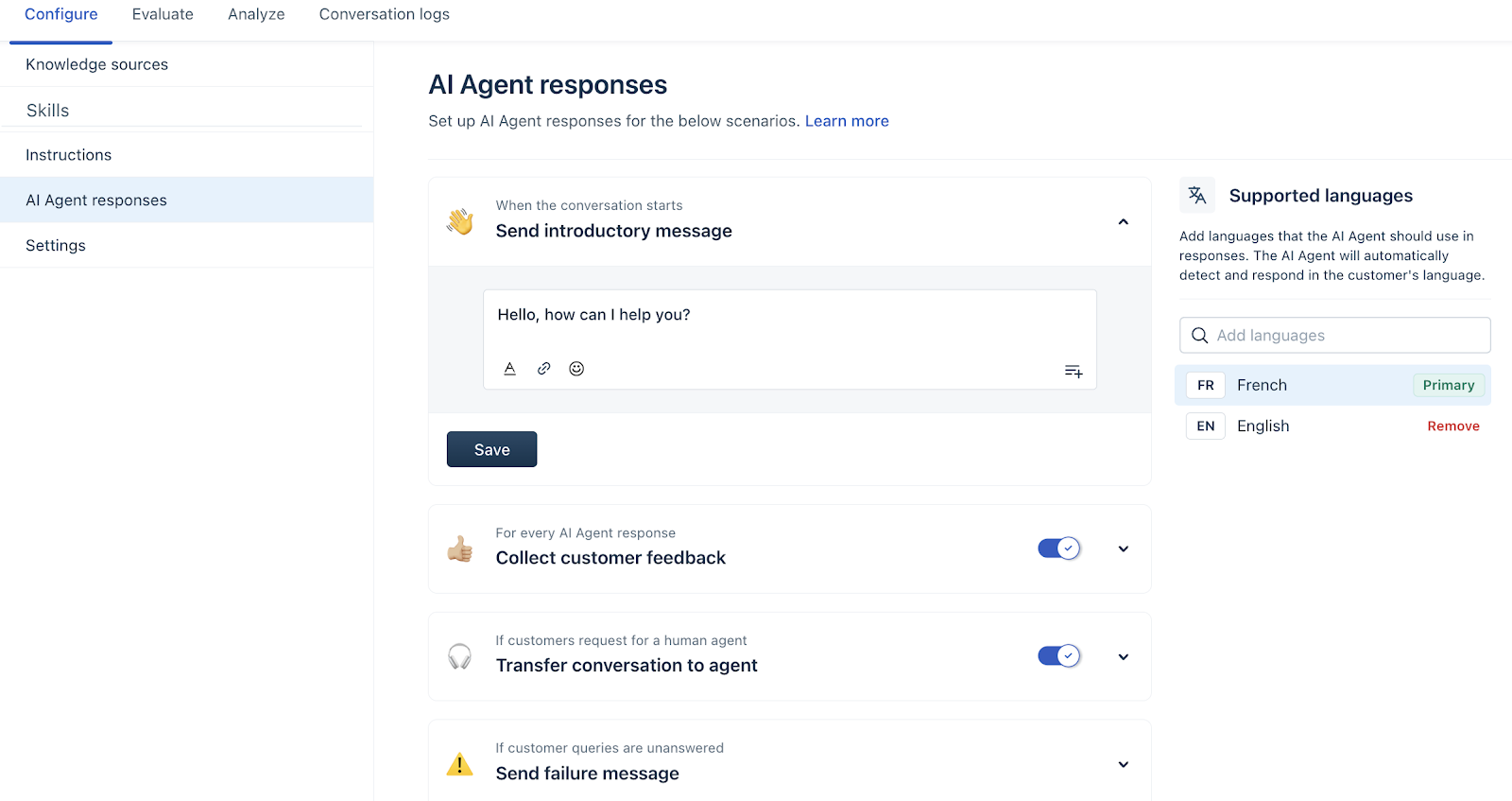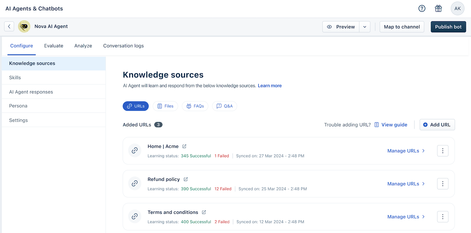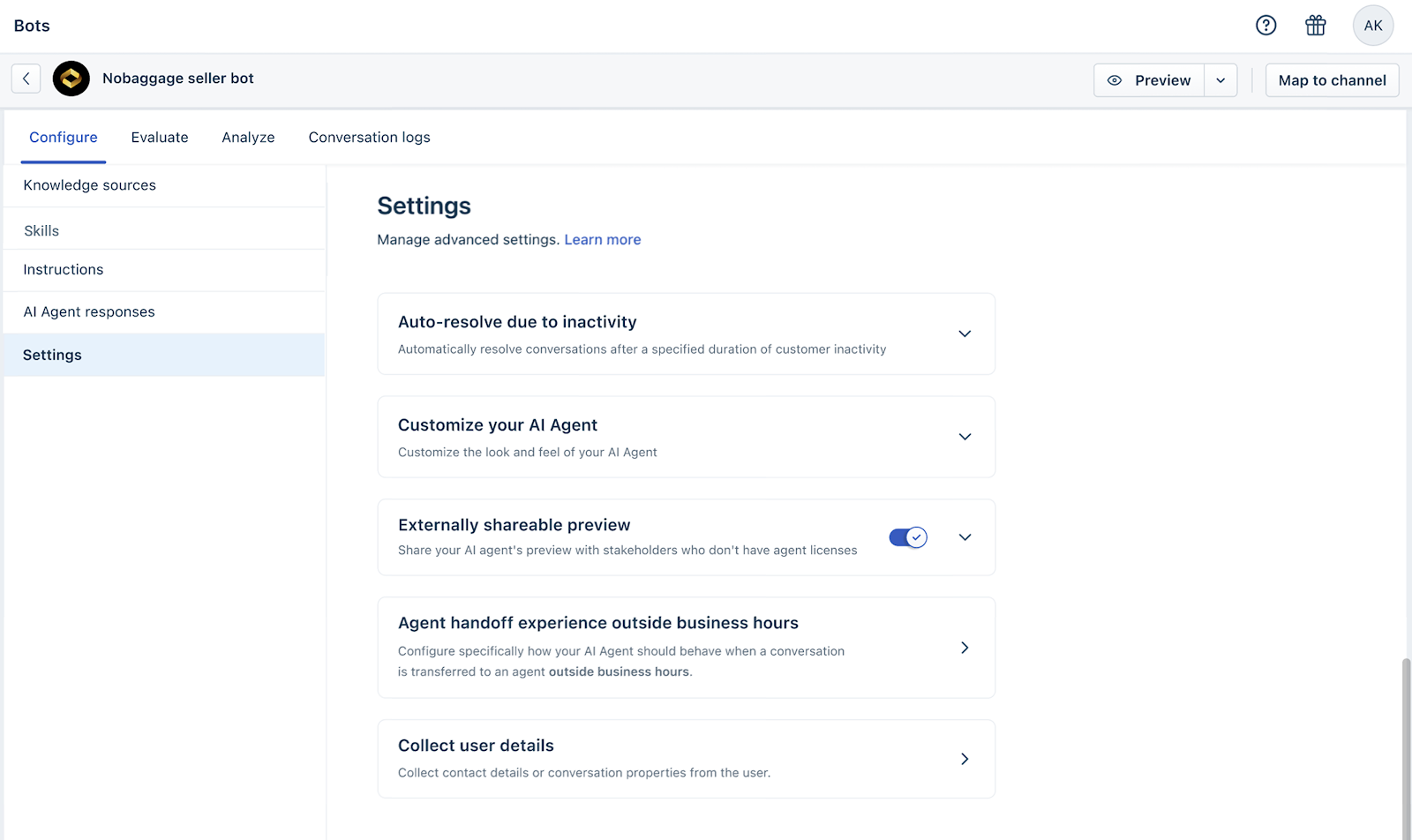 Configure the AI agent (Add knowledge sources, Configure bot messages, and other settings)