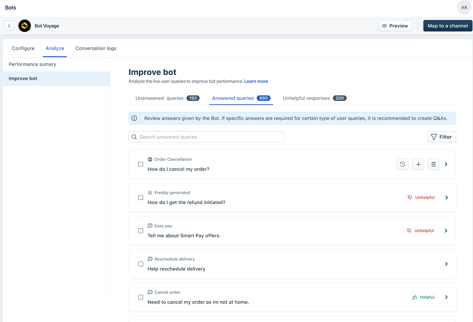 Answered queries: You can review the answers provided by the bot. It is recommended that you create Q&As to respond with specific answers to certain queries