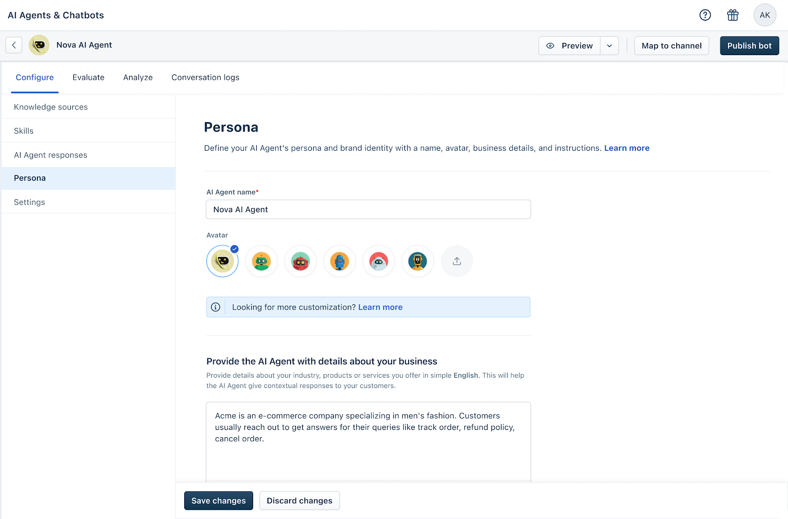 Customize - Set the AI agent name and avatar. Click Advanced customization for further customization.