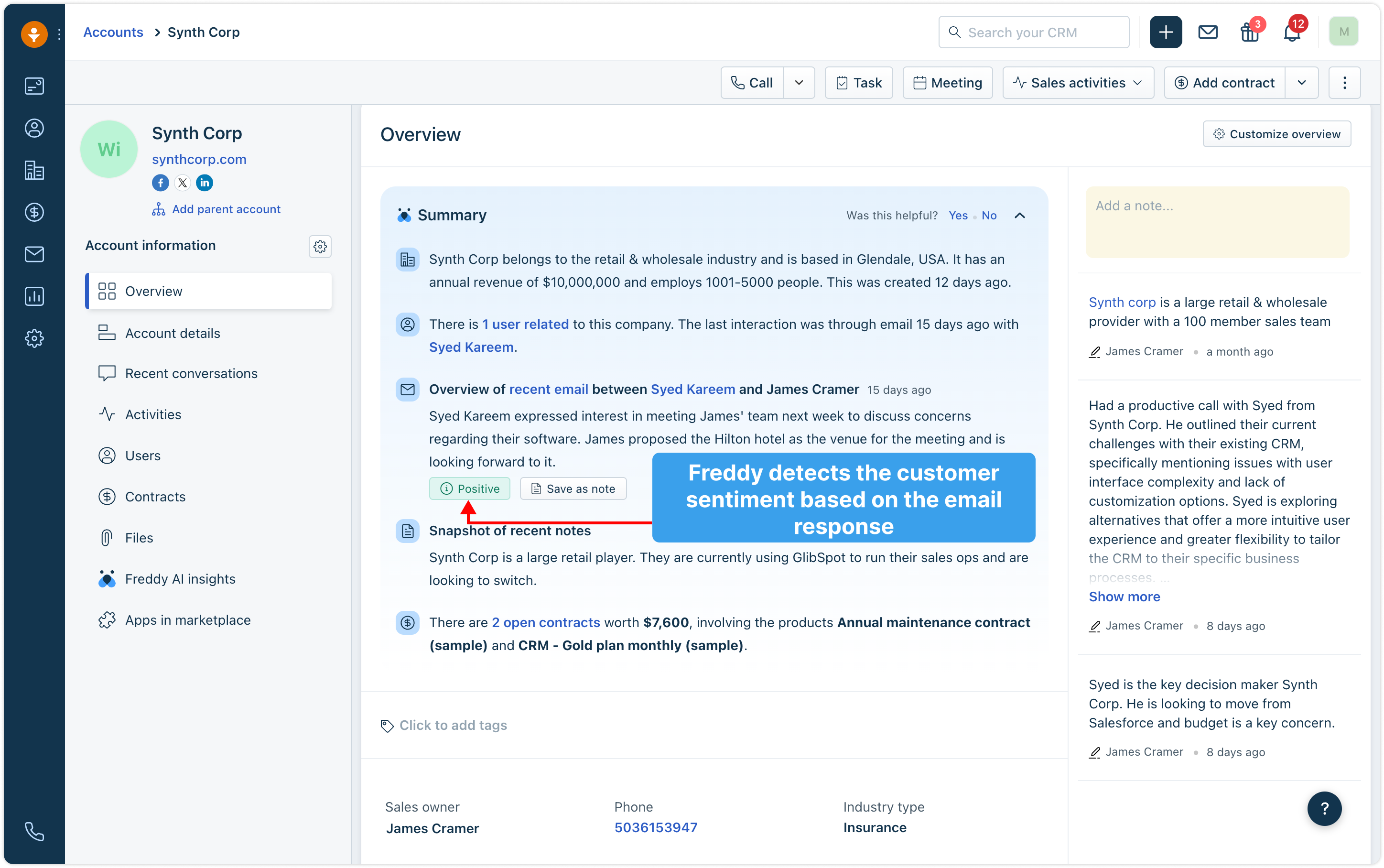Freddy AI summarizes the most recent email conversation thread associated with the contact or account to help you understand the sentiment. Click Save as Note to save this overview to your notes for future reference.