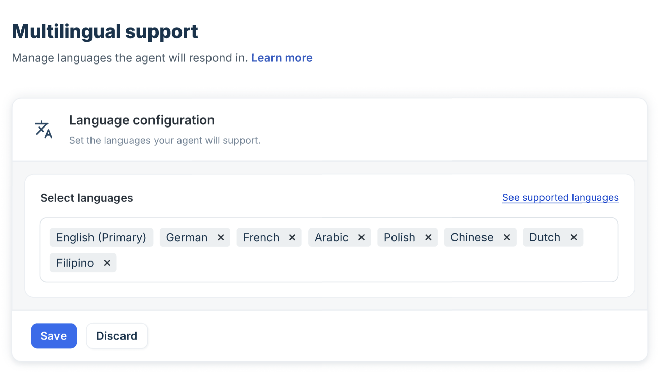 Multilingual support enables the AI Agent to reply in various languages depending on user input. Choose from the pre-configured list of supported languages—click the 'See supported languages' link to see them. This feature guarantees a consistent user experience across different regions and customer groups.