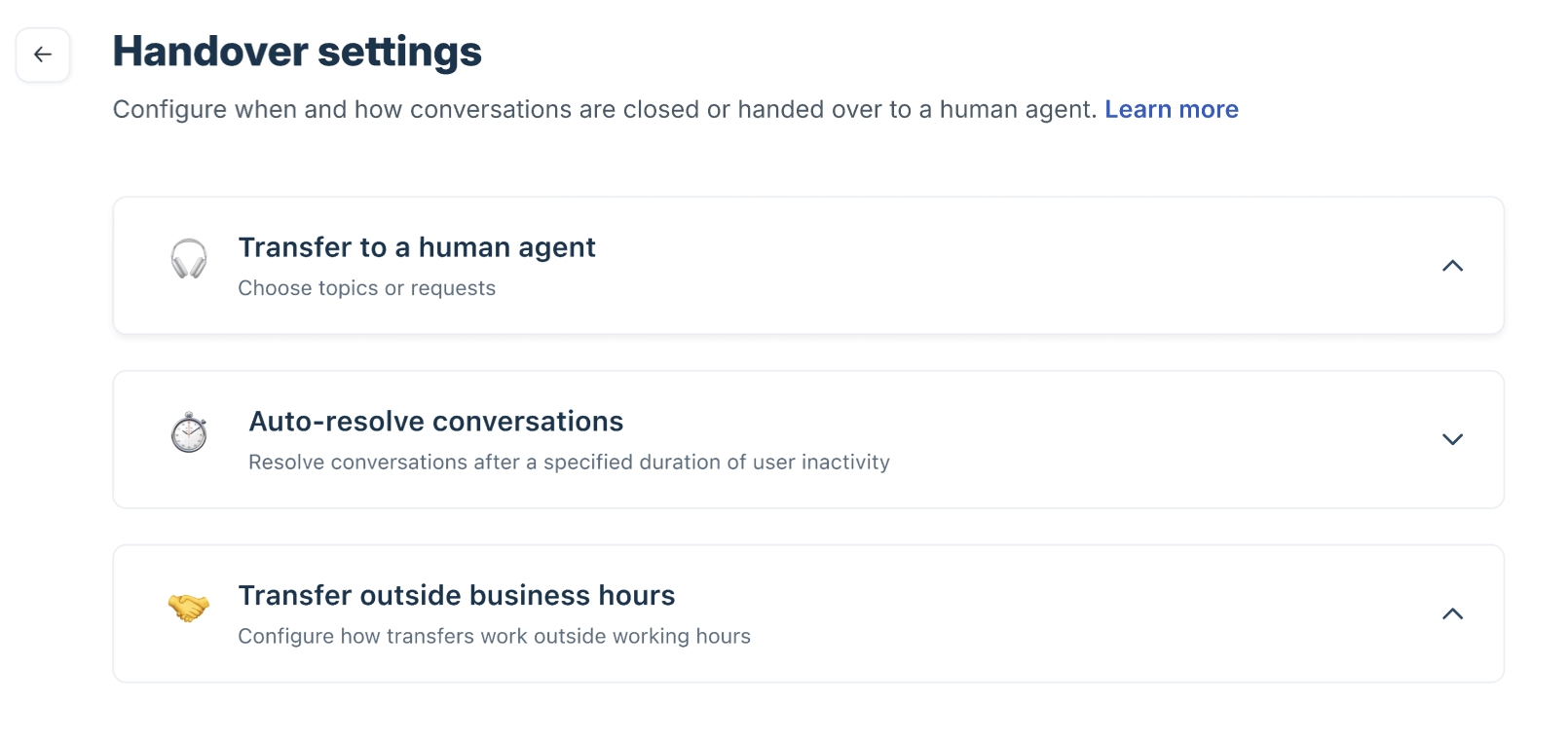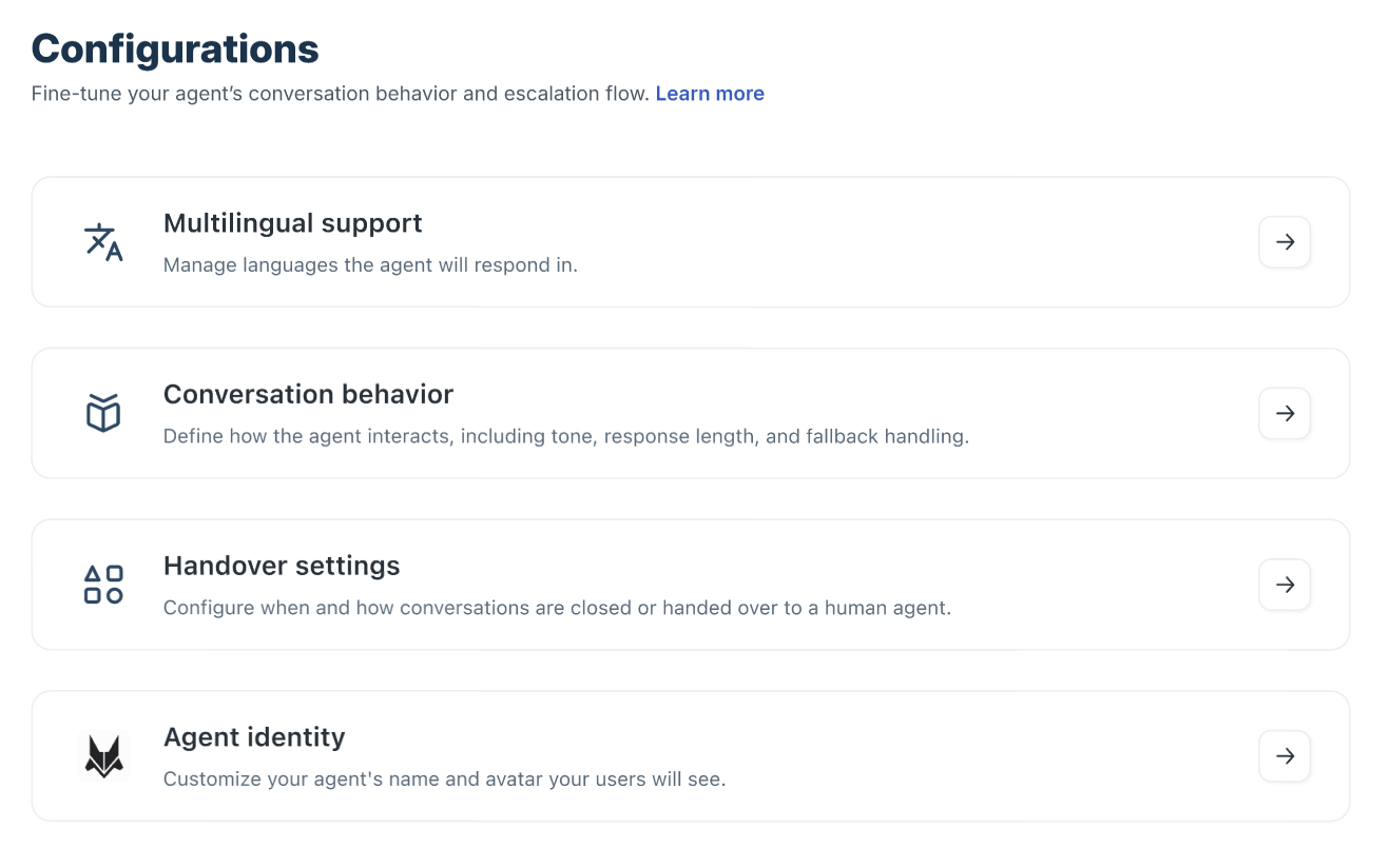 - Handover settings: Configure when and how conversations are closed or transferred to a human agent.