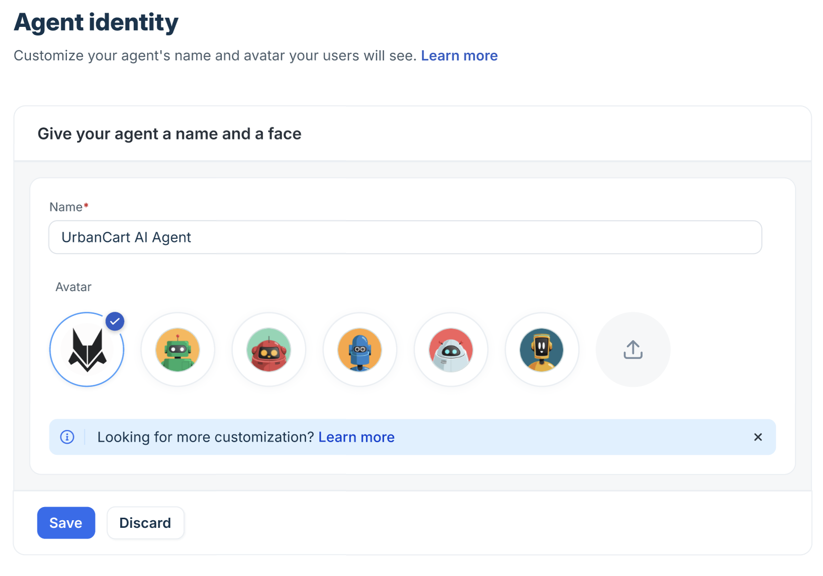 - Agent identity: Personalize the agent’s name and avatar visible to users.