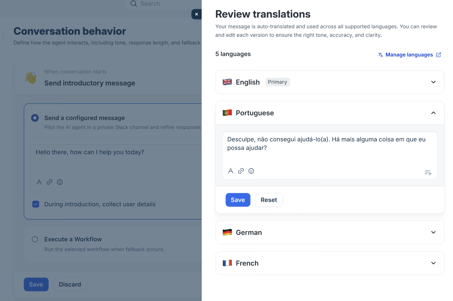 - Click Review translations to verify and edit the auto-translated message, used across all supported languages to ensure the correct tone, accuracy, and clarity. Click Manage languages link to add or remove supported languages.