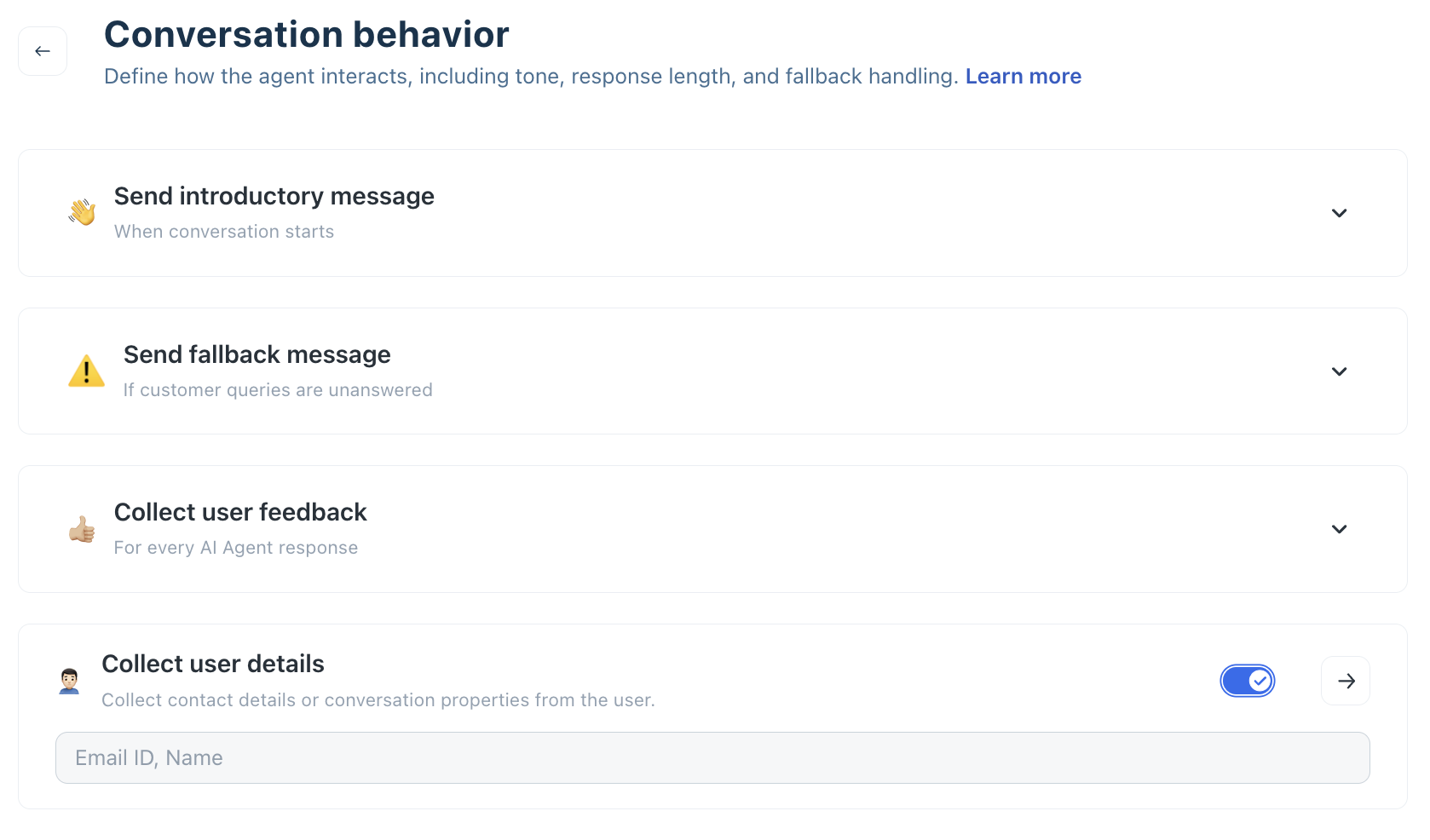 - On the AI Agents Configurations section > Conversation behaviour tab > select Collect user details.