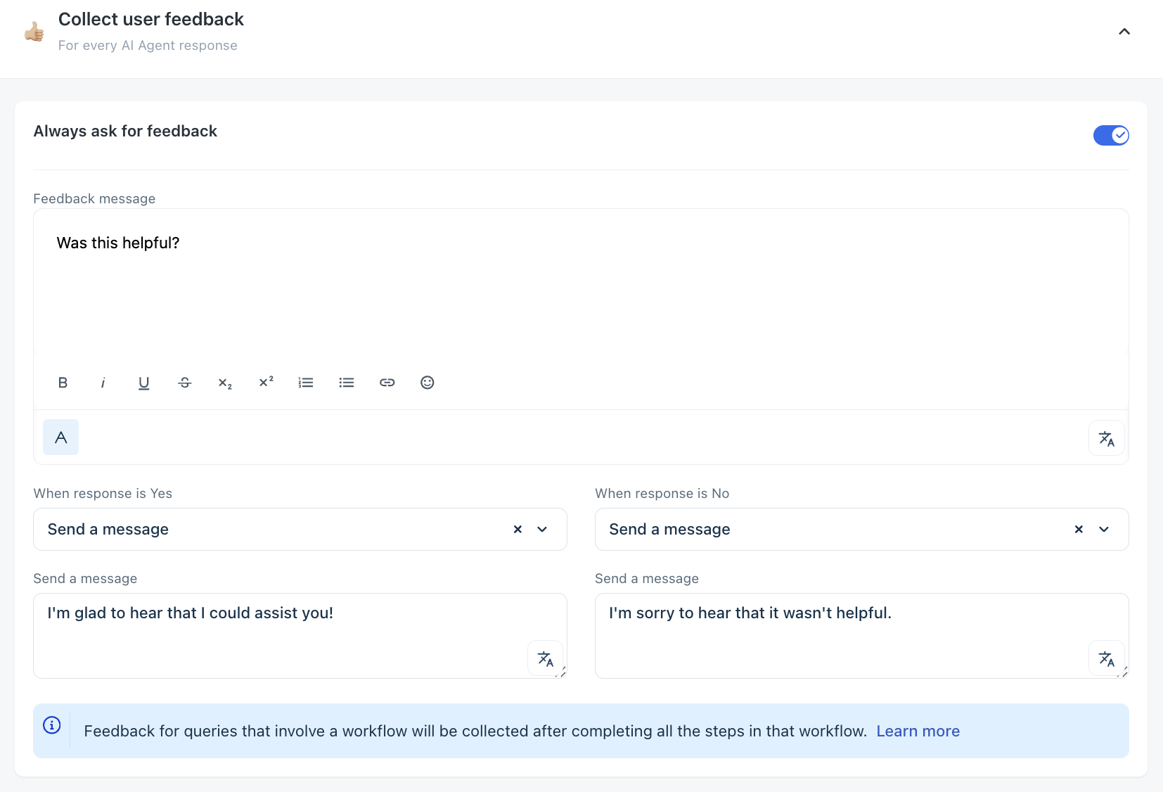 Collecting feedback from your customers helps you continuously improve the accuracy and overall experience of your AI Agent. You can customize the feedback prompt using rich text, links, and emojis to make it more engaging and consistent with your brand voice.