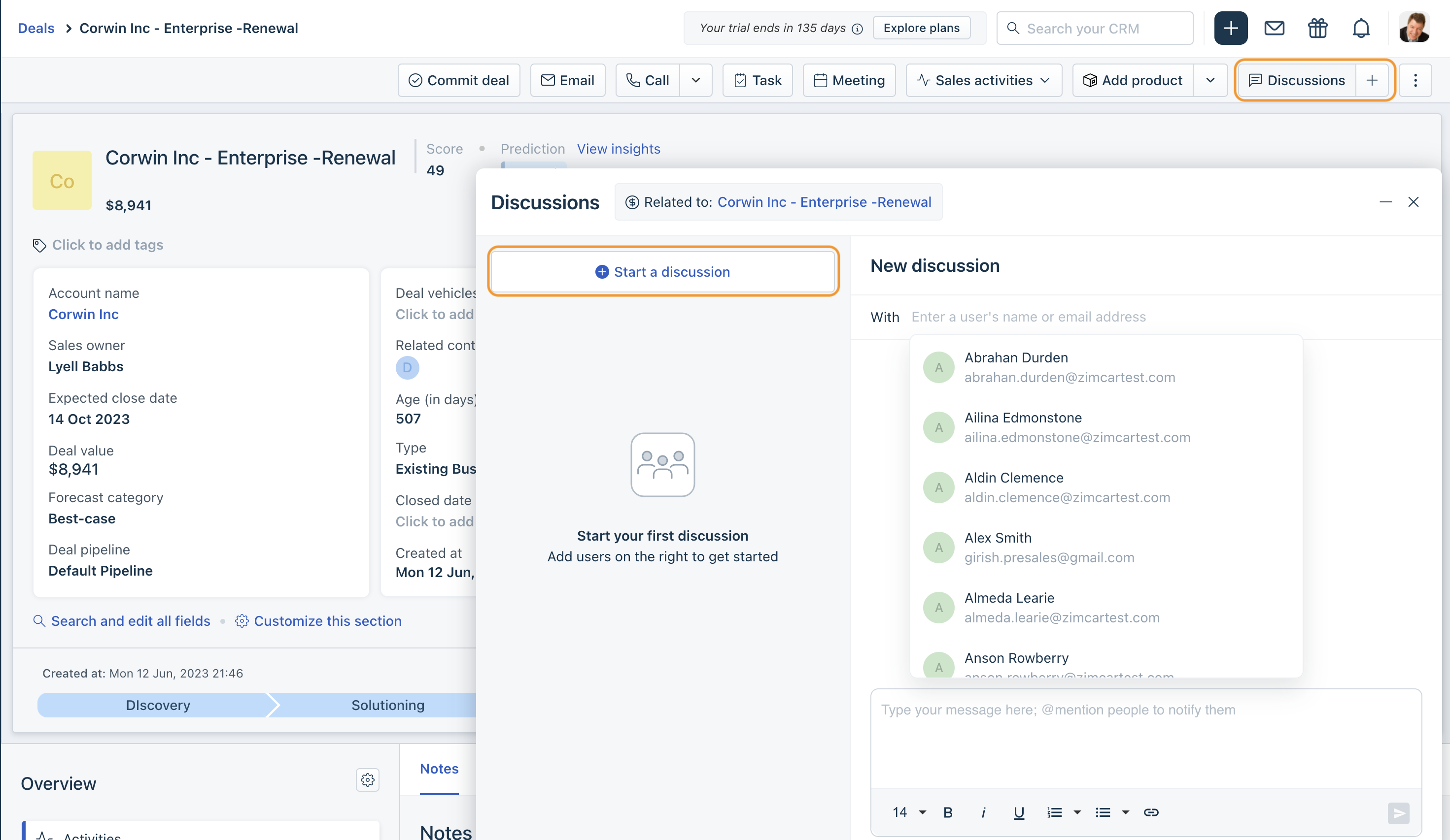 Initiate Discussions on Deals: Start discussions directly on deals and bring in relevant participants for focused collaboration.