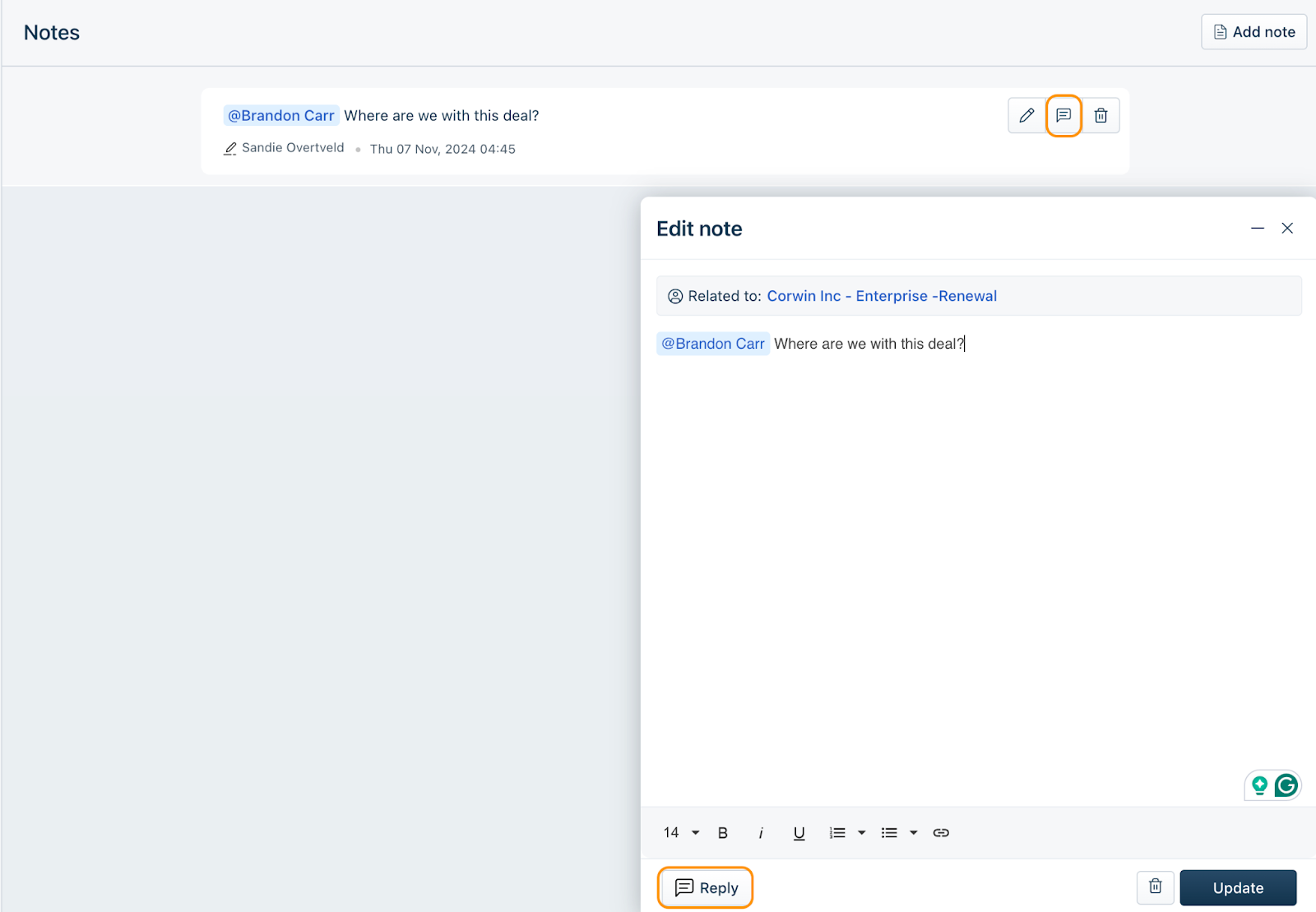 You can start discussions from notes added to deals. Click Reply on a note, and a new discussion will open, with a snippet of the note included at the top.