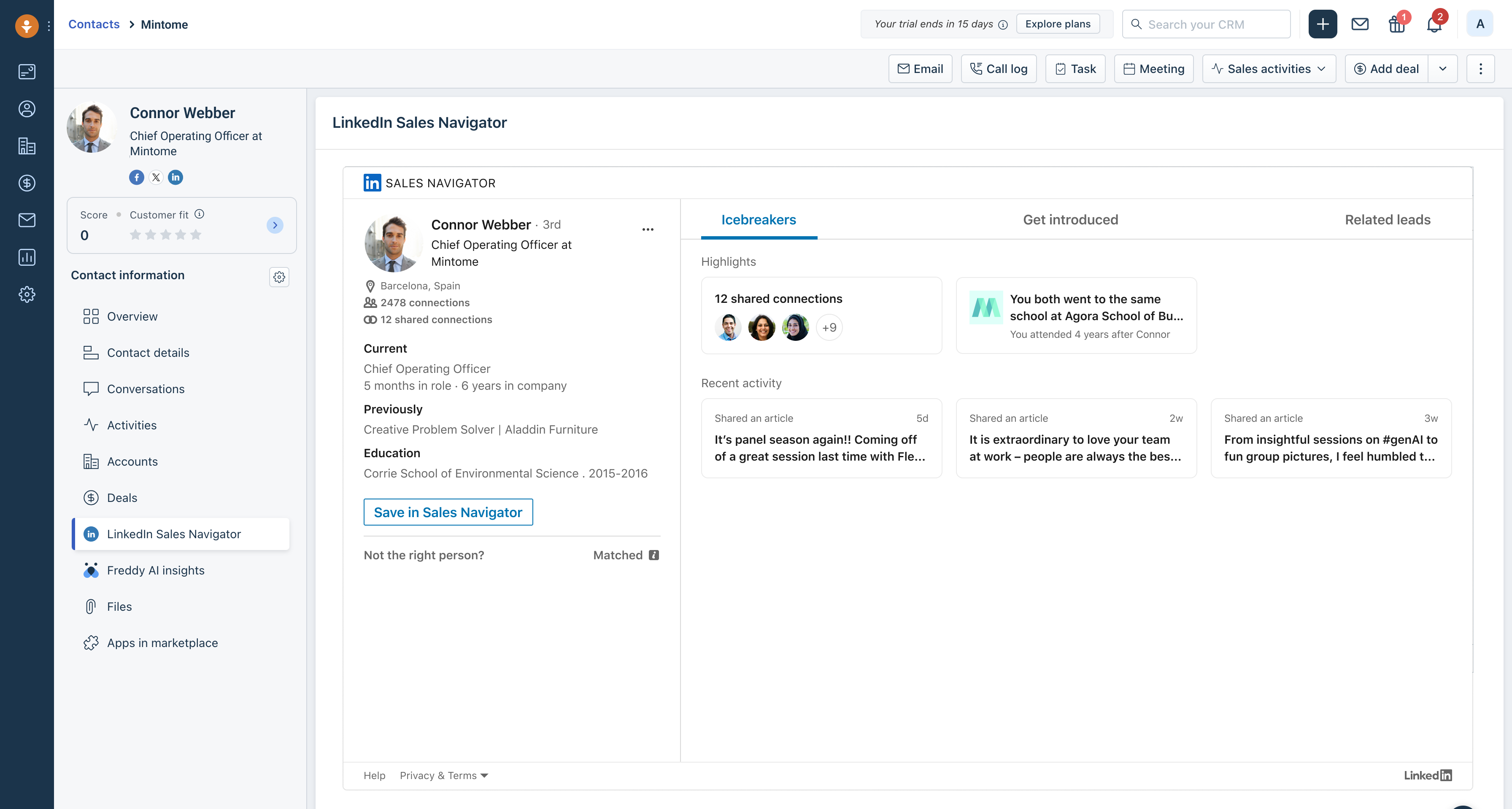 Icebreakers: Uncover shared connections, experiences, and interests to personalize your outreach, quickly warming up leads. You can see icebreaker suggestions directly on the contact's profile within Freshsales.