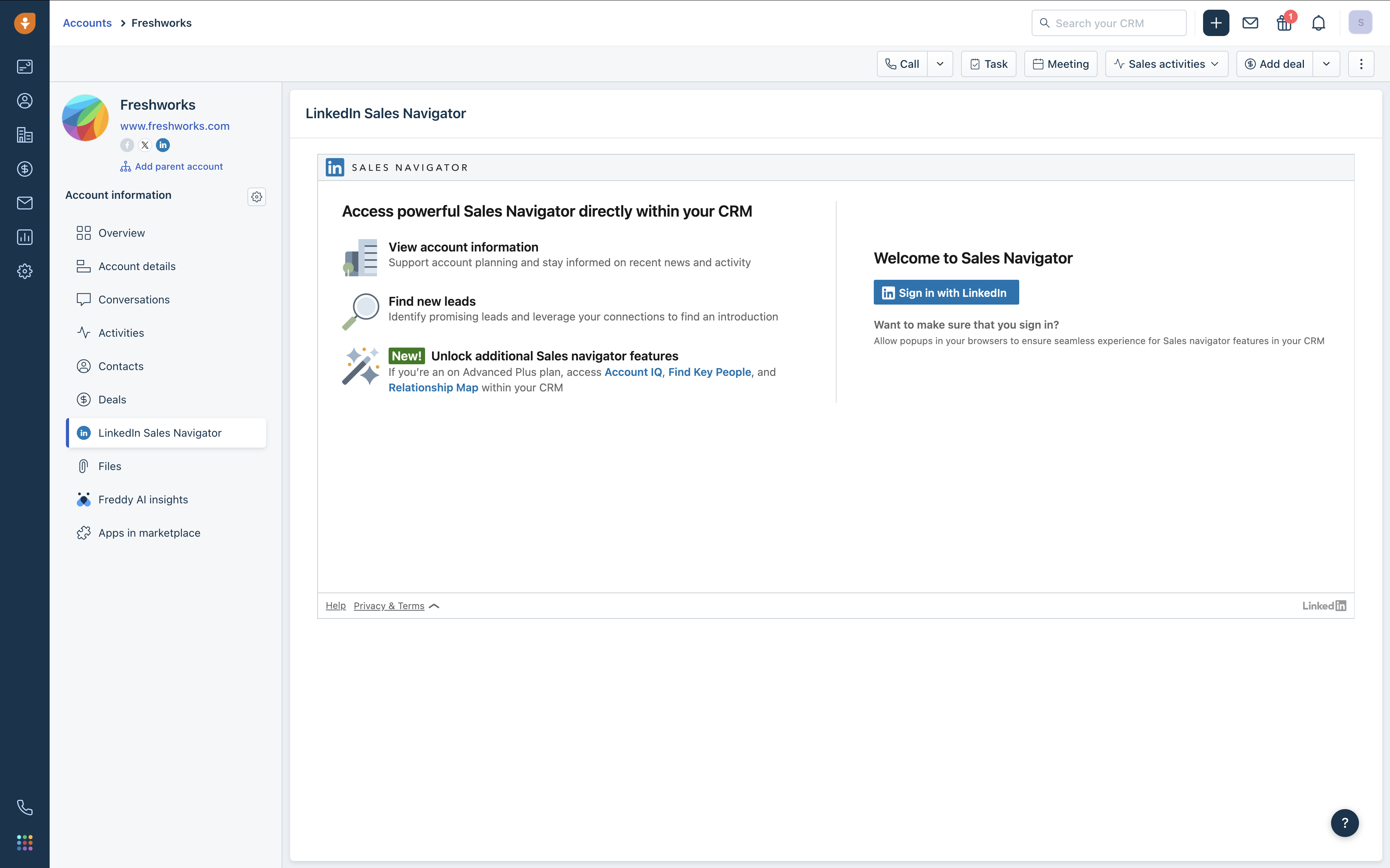 Once installed, the LinkedIn Sales Navigator integration will be visible on Contact and Account profiles within your Freshsales instance. Each user must sign in to connect their LinkedIn Sales Navigator account with Freshsales.