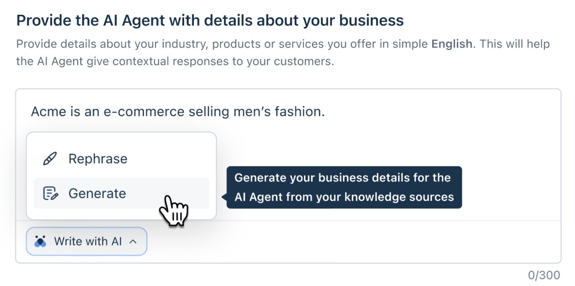 Use the Write with AI option to help draft or rephrase your input. You can also auto-generate this content from your existing Knowledge Sources to save time and maintain consistency.