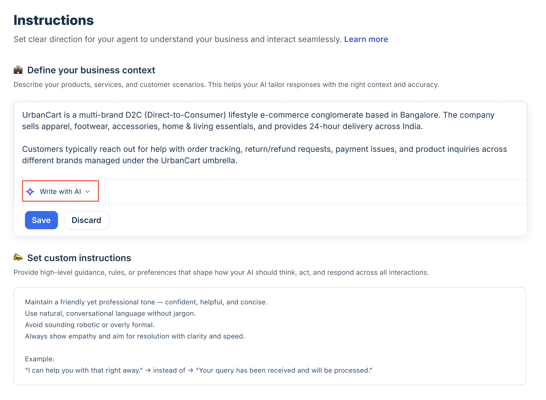 The Instructions section helps you define how your AI Agent understands your business and how it communicates with customers. By setting clear context and response guidelines, you ensure every interaction is accurate, consistent, and aligned with your brand.