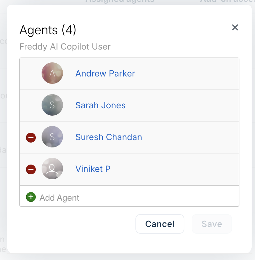 2. Scroll to Freddy AI Copilot User, hover, and click on Agent under the Assigned Agents column.