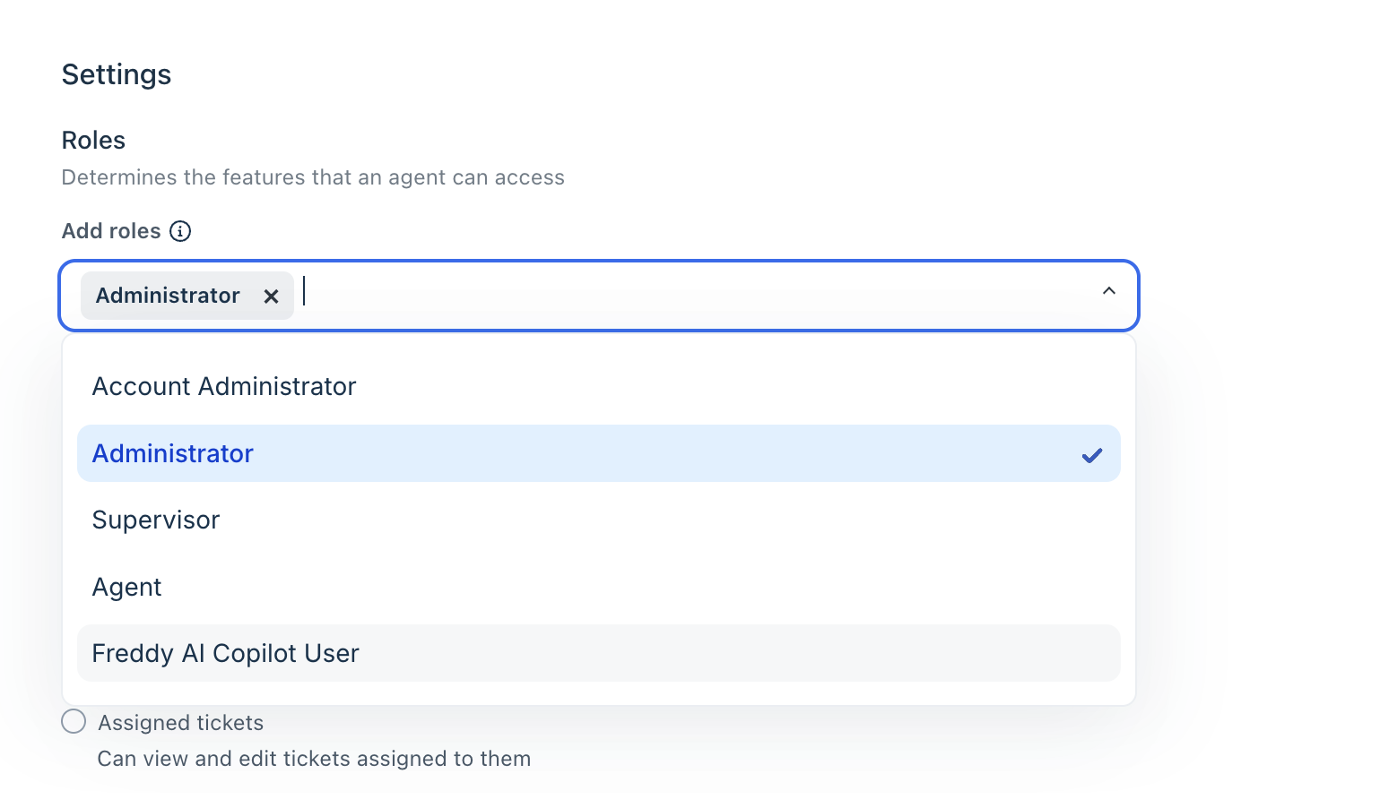 3. Under Settings, click Add roles choose Freddy AI Copilot User.