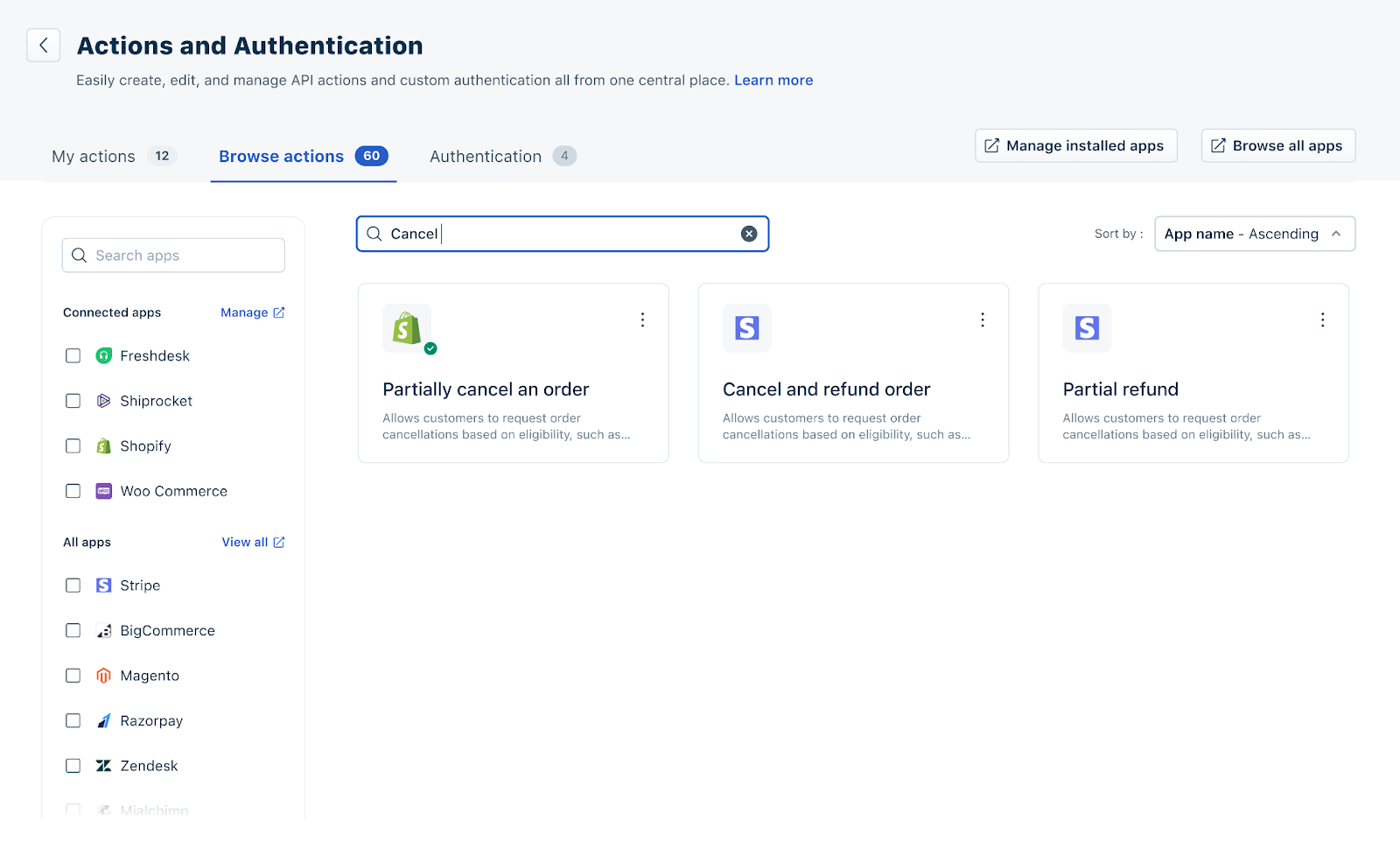 Here, you can select the Action that you want for a particular app. You can search by Action (for example: Get order details) or app name (for example: Shopify). You can also filter by specific apps on the left, so Actions related to those apps alone show up.