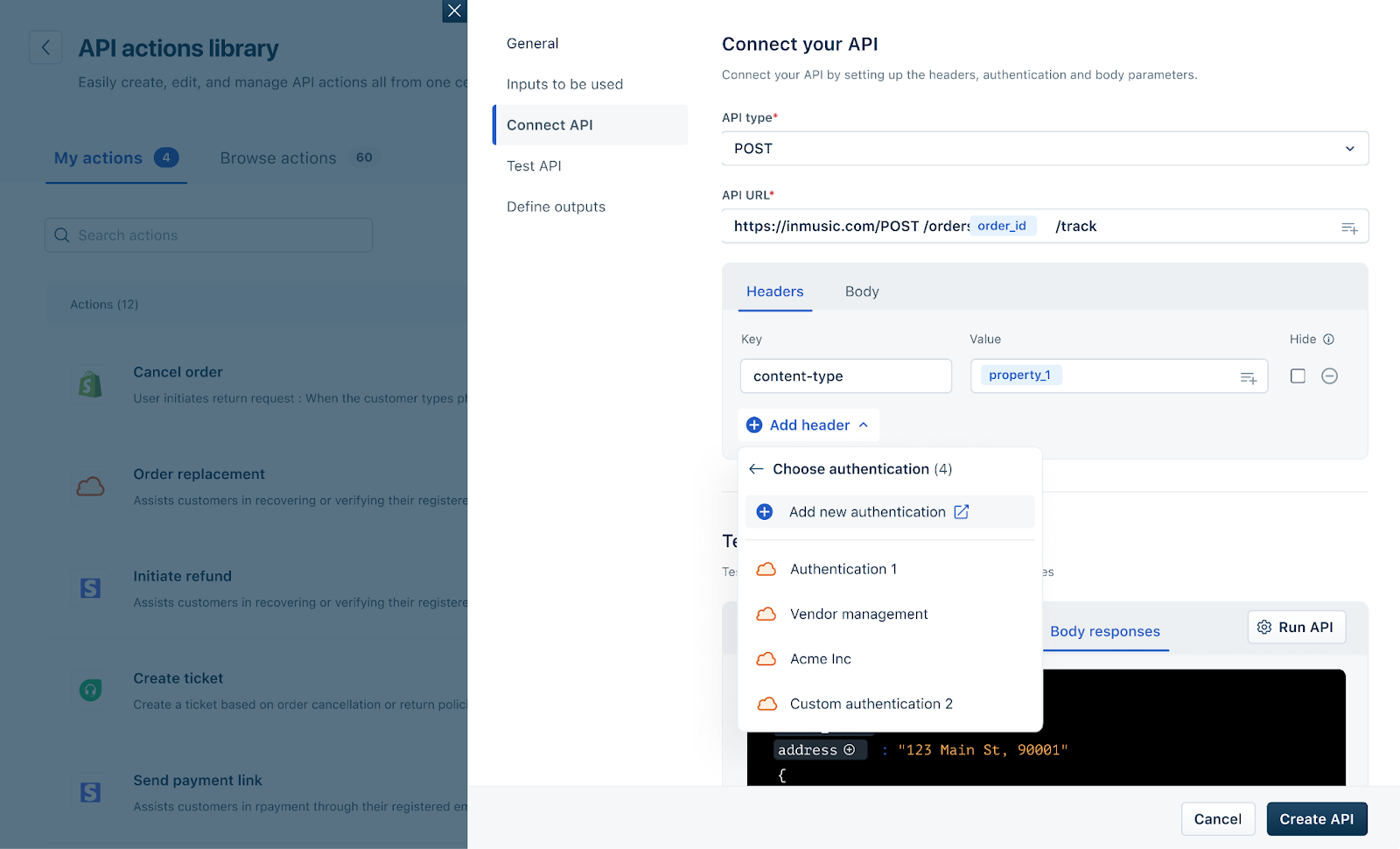 Once all fields are filled and tested, click Create API to save your Action. Your new Action is now ready to be used within a Workflow.
