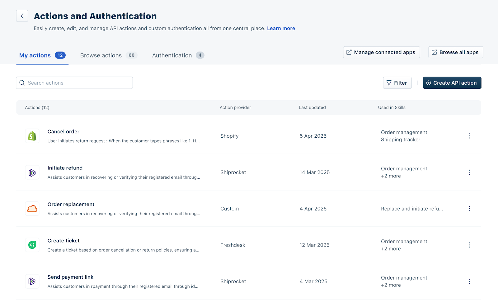 My actions: This tab lists the Actions linked to Workflows. You can view the Action Provider (for example, Shopify, Shiprocket, Fresdesk), along with the Workflow/s (for example, Order management, Shipping tracker, etc.) the Action is used in.