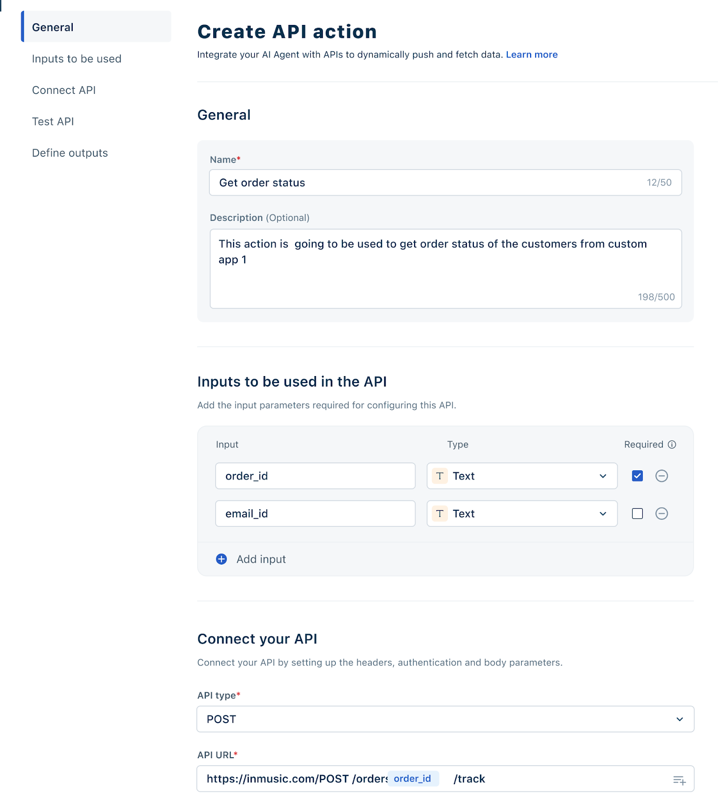 Under Inputs to be used, add the input parameters required for configuring this API. For example, order_id. You can also choose the input type (Text, Number, etc.) and mark it as Required if needed.