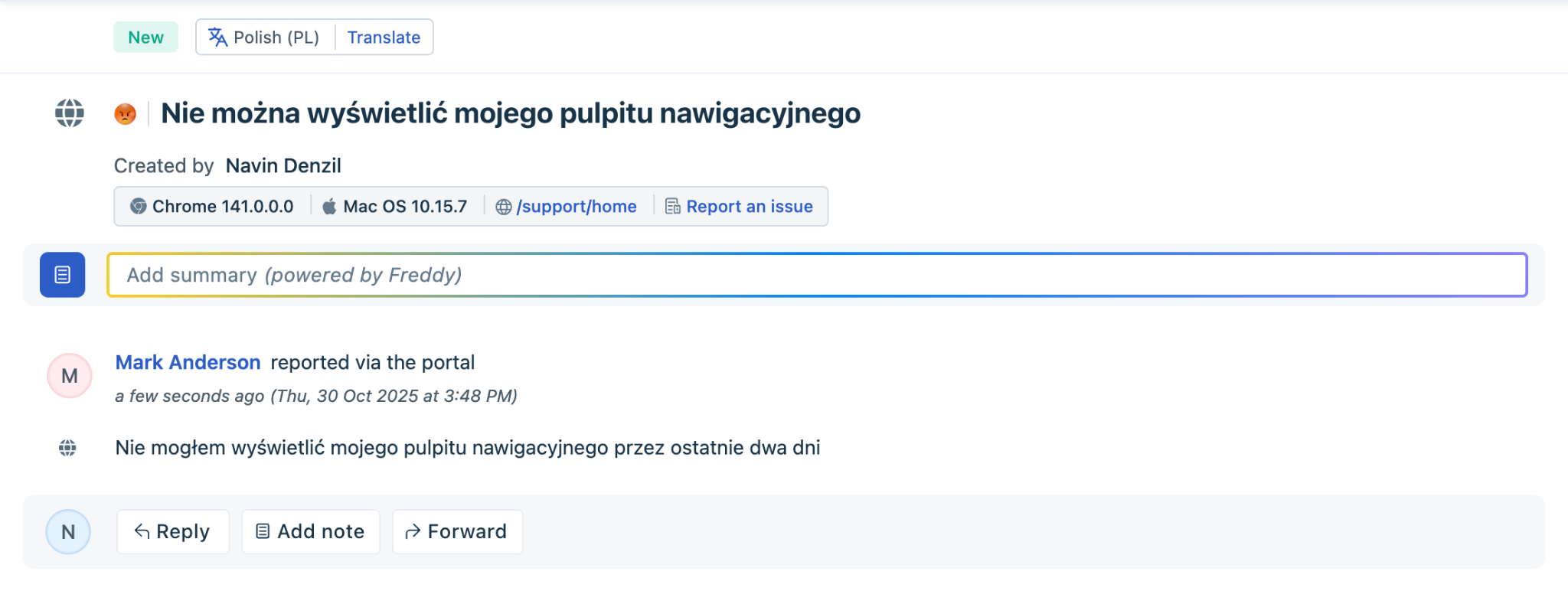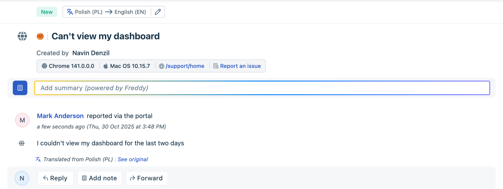 Freshdesk’s Live Translation feature helps agents seamlessly communicate with customers in different languages. Powered by Freddy AI, it automatically detects and translates ticket conversations in real time, ensuring language is never a barrier to great support.