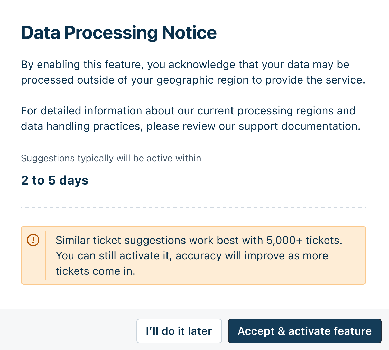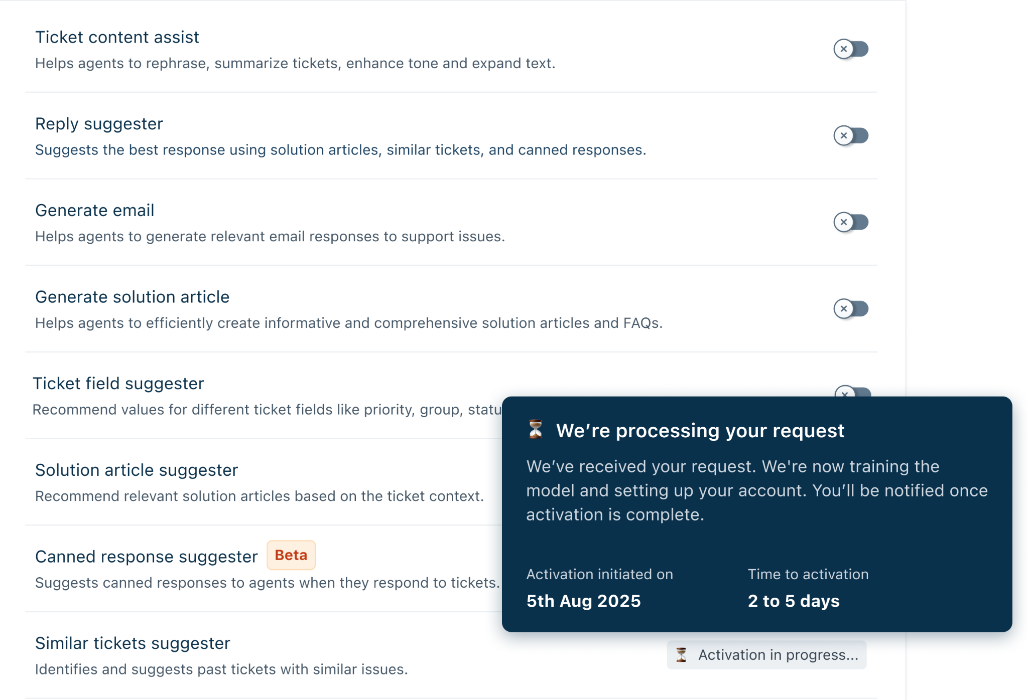 - An Activation in Progress tag will appear near the Similar Tickets suggester toggle until the feature is fully operational. Hover over this tag to see the activation date.