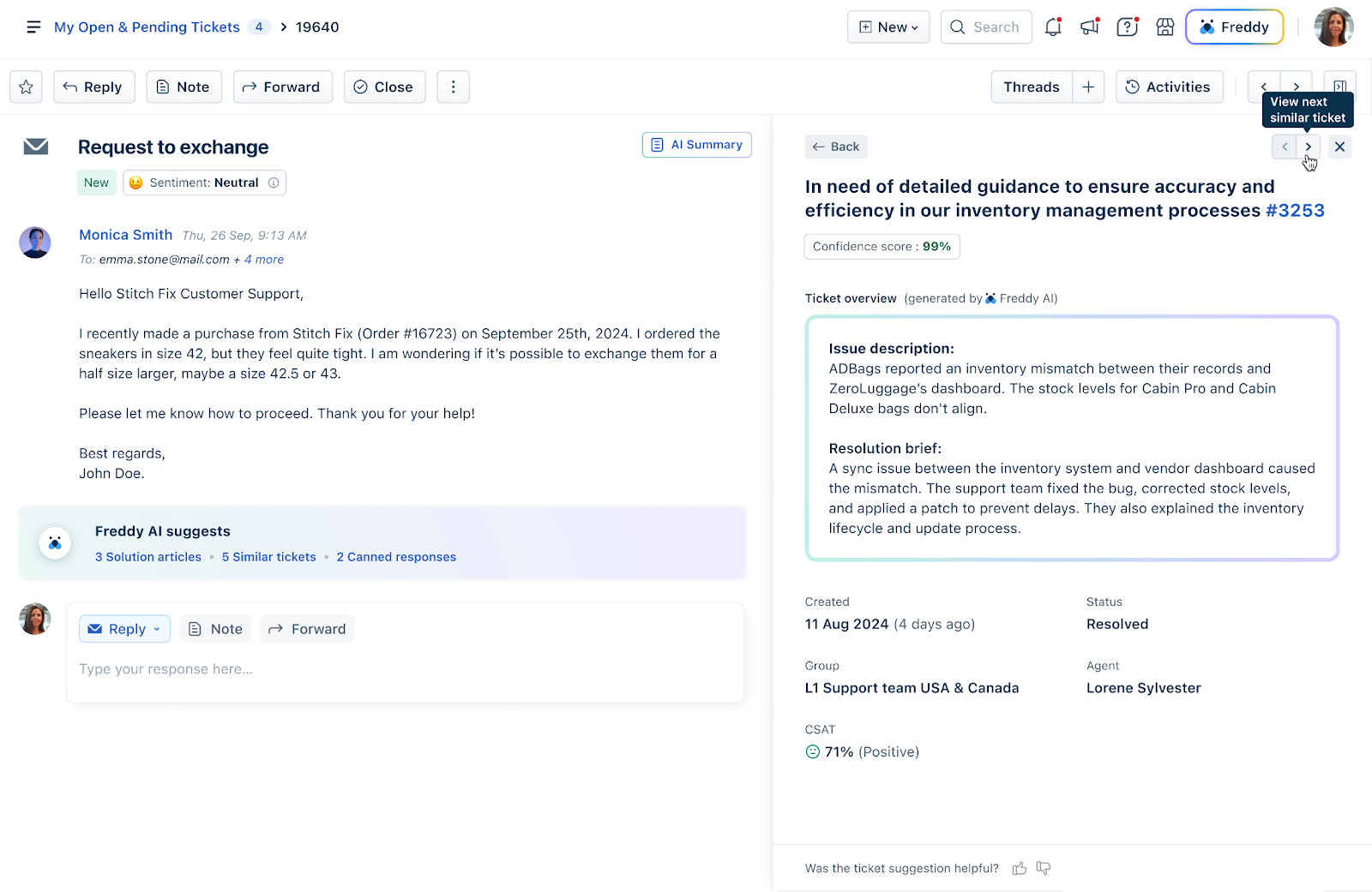 - Click the arrows at the top to view the next similar ticket. You can also click on the ticket ID to open the ticket and view the entire thread.