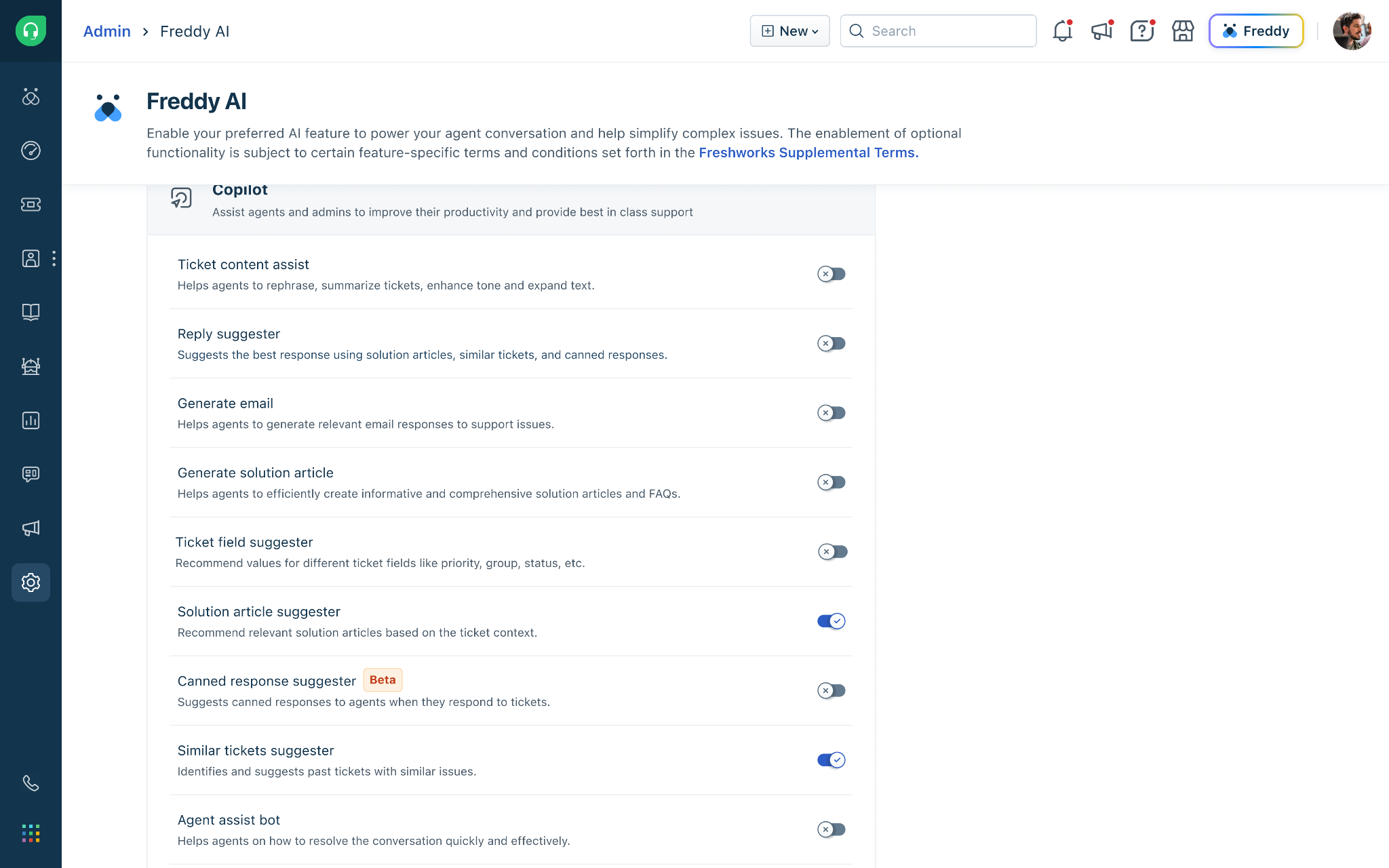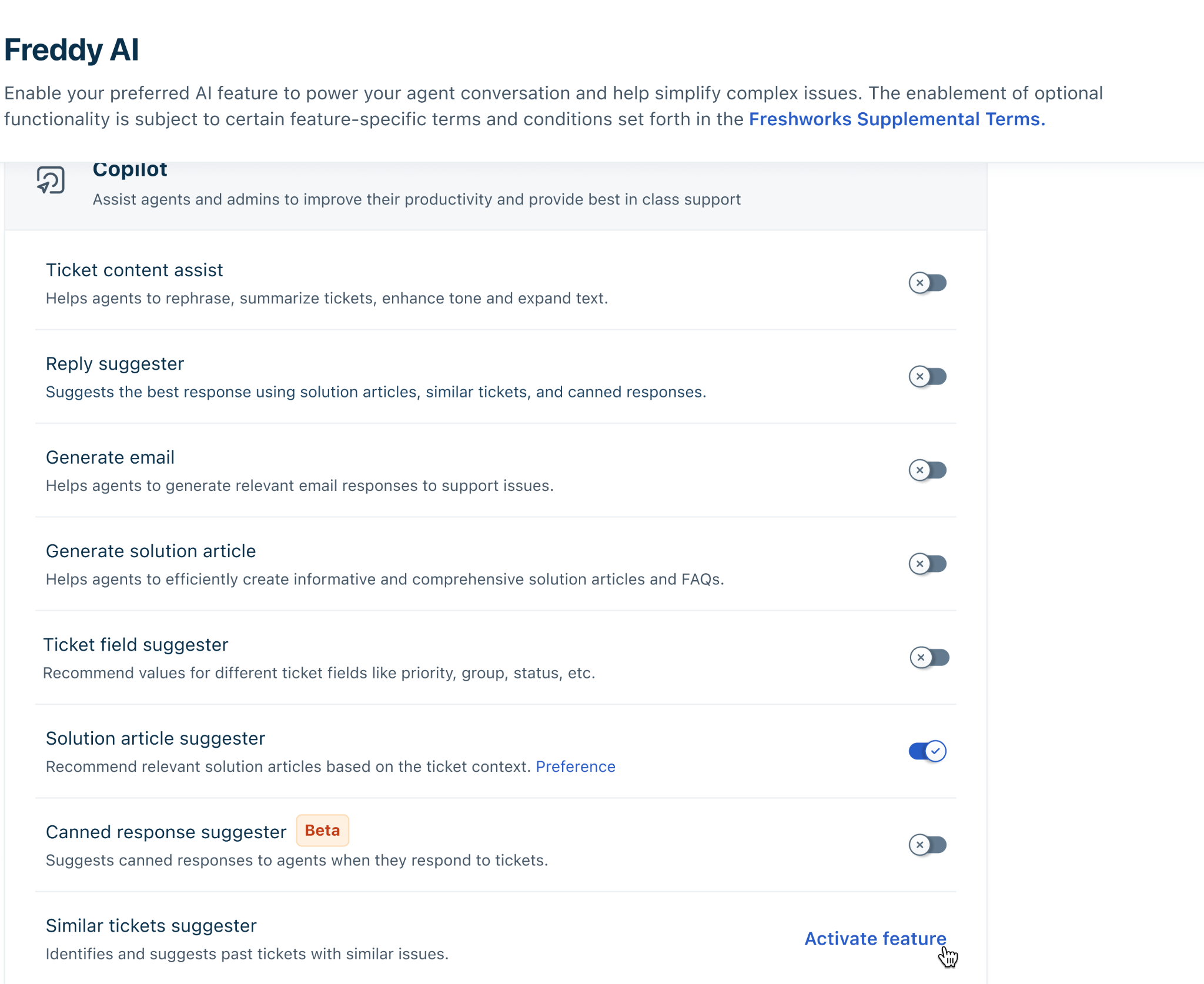 - Go to Admin > Freddy > Similar tickets suggester > Activate feature