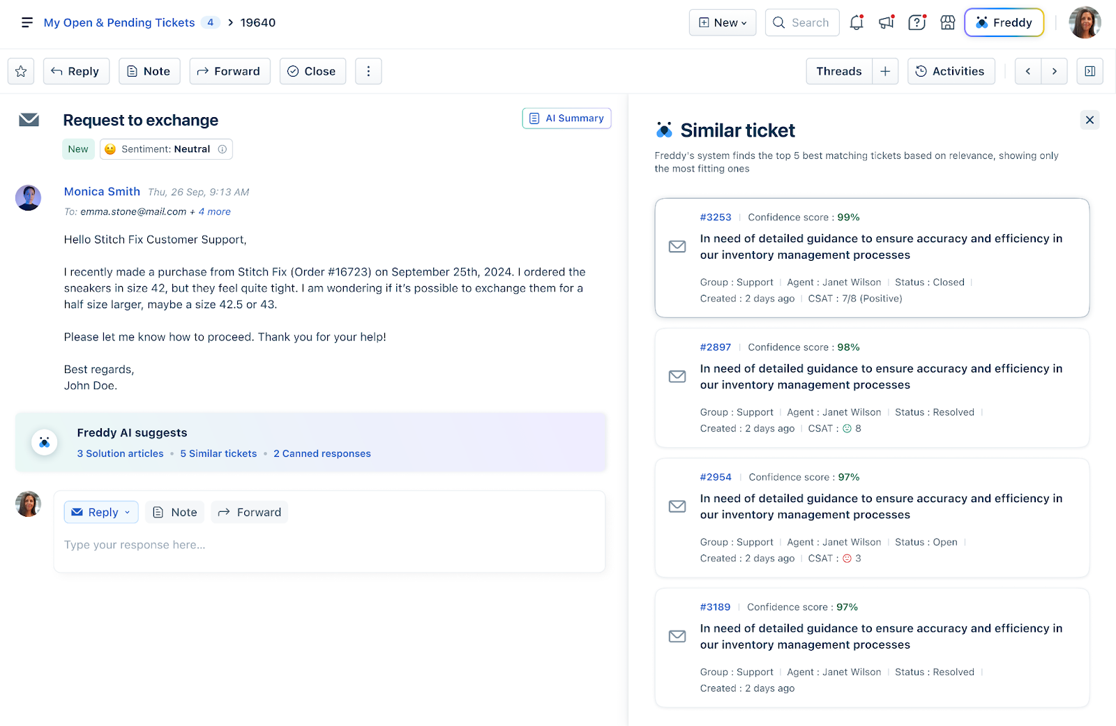 The Similar Tickets feature helps agents resolve tickets faster by automatically suggesting past, resolved tickets that are contextually similar to the one they’re working on. This provides agents with quick access to relevant resolutions, eliminating the need for manual searches of ticket history.