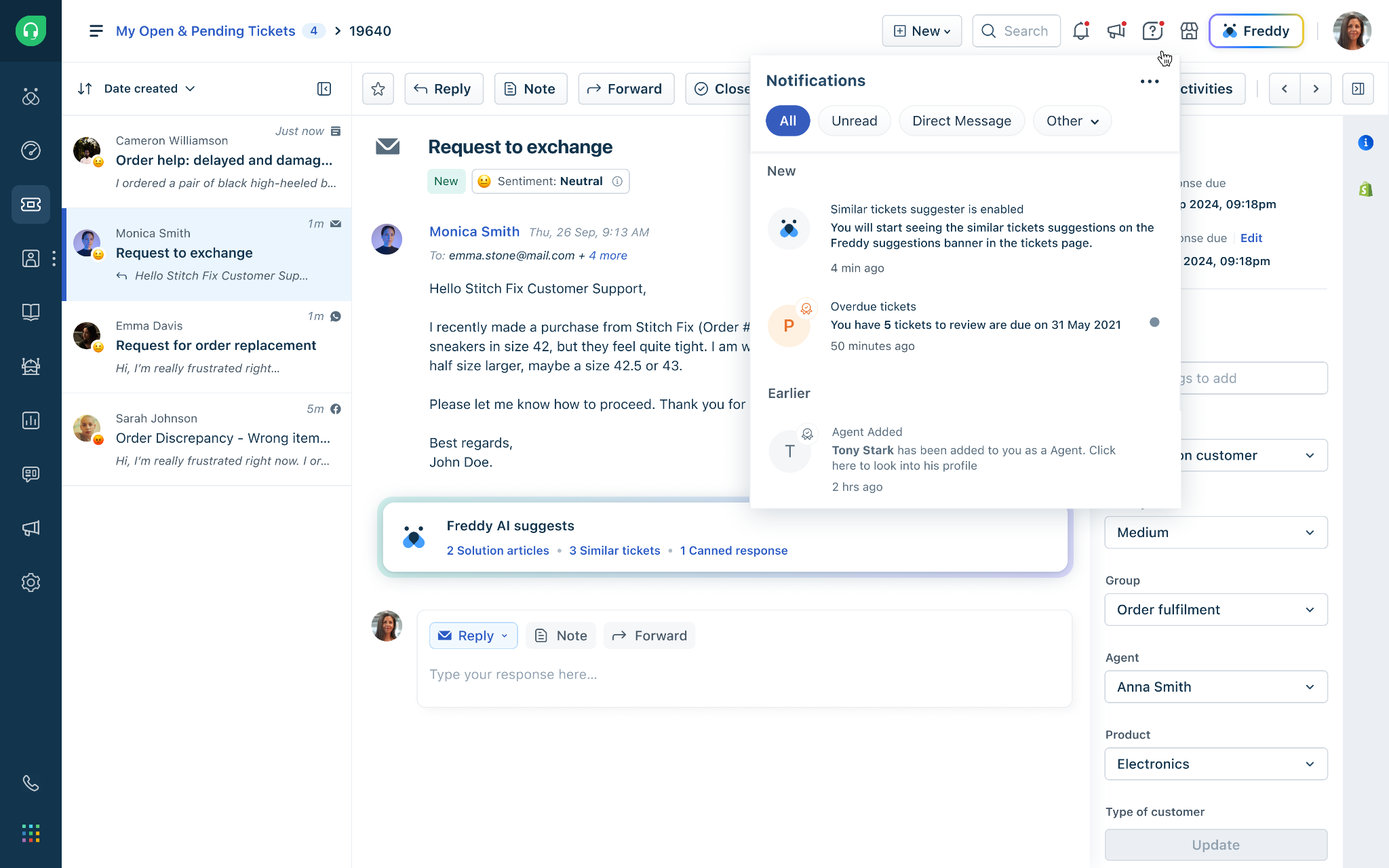 - You can access Similar Tickets under Freddy Suggestions in the ticket details page
