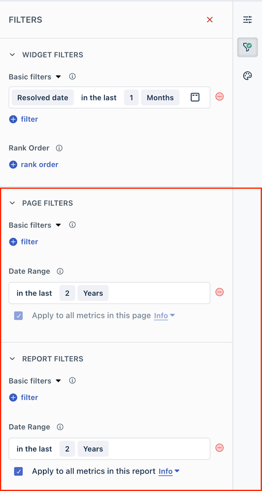 At both the report and page levels, users have the option to create date range filters, which apply to the entire report or only to the specific page. A date range functions as a filter that influences the data retrieved within those specified periods.
