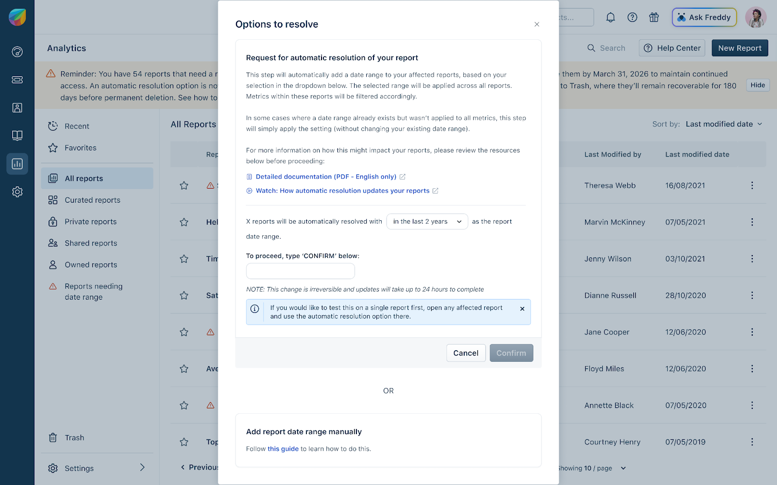 Click See how to resolve your reports to open a pop-up with details about automatic report range updates. In the consent box, type CONFIRM and click Confirm to automatically apply a date range to all your reports.