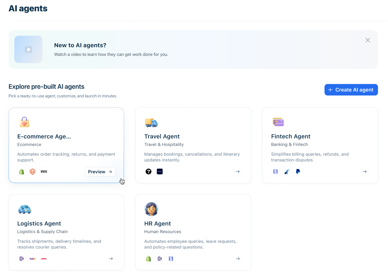 The AI Agents Library lets you skip building workflows from scratch by offering ready-made AI agents tailored to your industry. Each vertical agent comes with preloaded agentic Workflows designed for specific domains—like E-commerce, logistics, IT services, and more—so you can quickly deploy an AI agent that understands your business context and common use cases right out of the box.