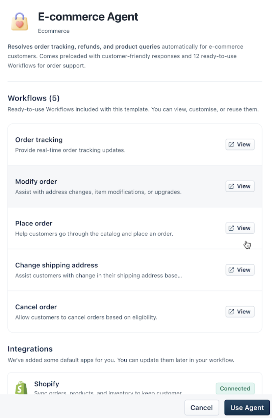 - On the E-commerce Agent that appears, you can view the pre-built Workflows that this AI Agent contains, including conditions, agent handoff, and other blocks/sections to comprehensively handle customer queries.