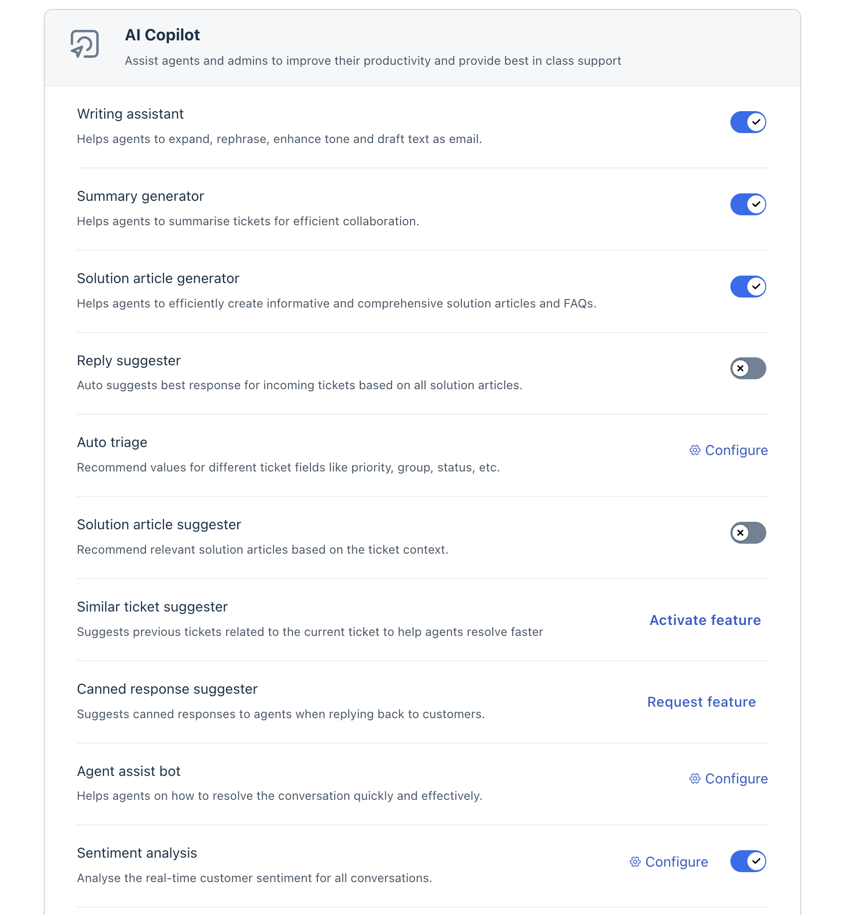 Enable Freddy AI Copilot from Admin Settings and activate features such as Summary Generator, Writing Assistant, and more. For instructions, see Freddy AI Copilot.