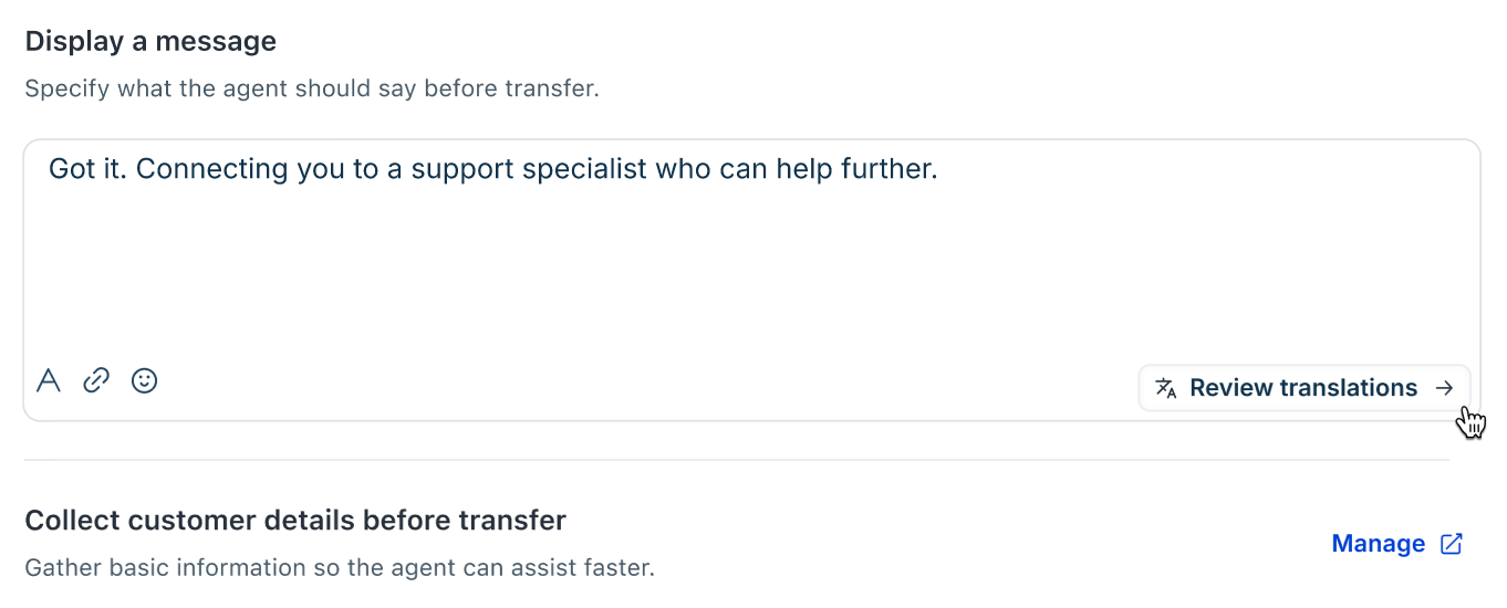 When the AI Agent detects these phrases, the conversation is automatically transferred. - Under Display a message, define the message the AI Agent should send before transfer.