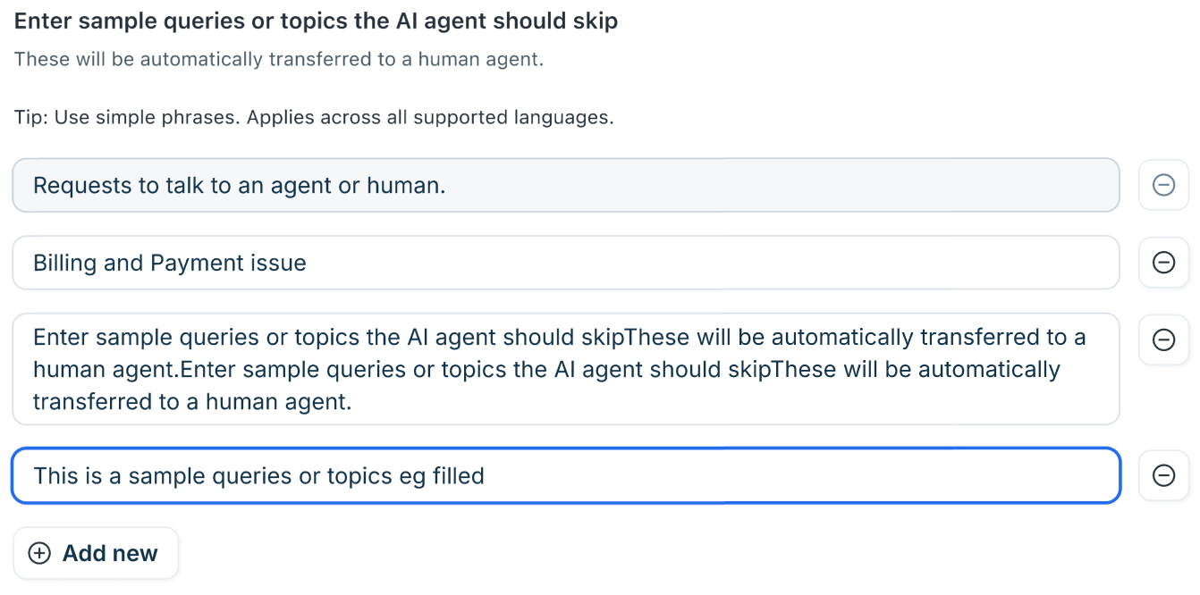 - Under Enter sample queries or topics the AI agent should skip, add phrases that should trigger automatic escalation