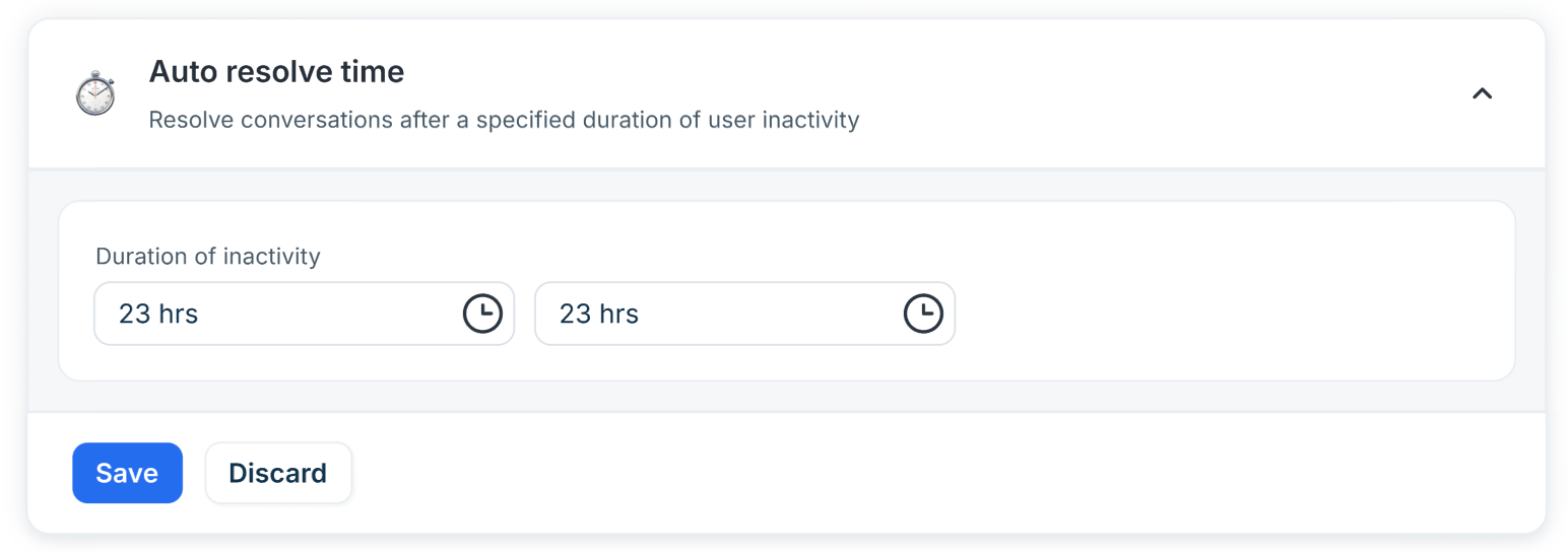 - Set the Duration of inactivity (in hours and minutes). Once the specified inactivity period is reached, the conversation is automatically marked as resolved.