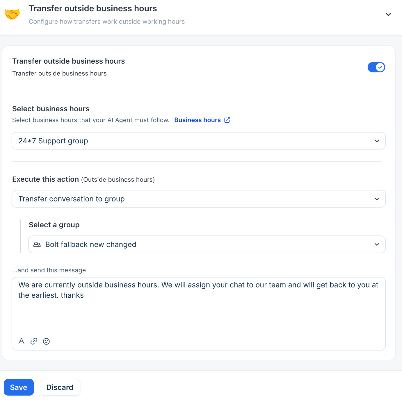 - Expand Transfer outside business hours and enable the toggle.